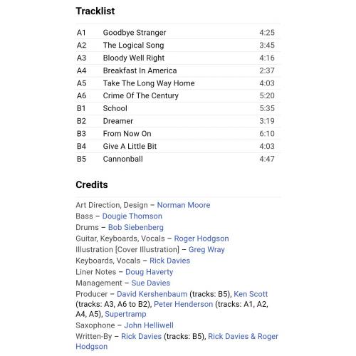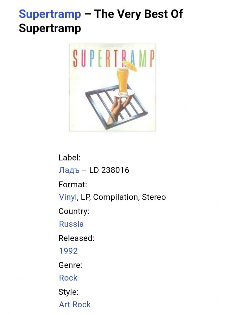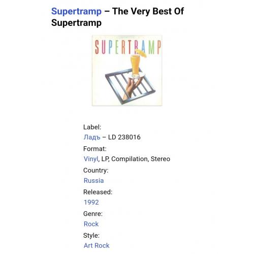 Вінілова платівка. Друга, в дискографії, офіційна збірка найкращих хітів, яка вперше була випущена в 1990-му році, Британської арт-рок, прог-рок групи Supertramp, до складу якої входили учасники Рік Девіс, Роджер Ходжсон, Дугі Томпсон, Джон Хелліуел, Боб Сібенберг, Річард Палмер, Кіт Бейкер, Дейв Уінтроп, Кевін Кюррі, Френк Фаррелл (The Very Best Of Supertramp) 1970-87. Випуск фірми (Ладь) Russia, 1992-ий рік. Стан платівки NM-. Стан конверту EX+. В комплекті внутрішня вставка. Відправка по Україні службами доставки: Нова Пошта, Укр Пошта, Делівері. Також відправляємо посилки за кордон по цілому світу.