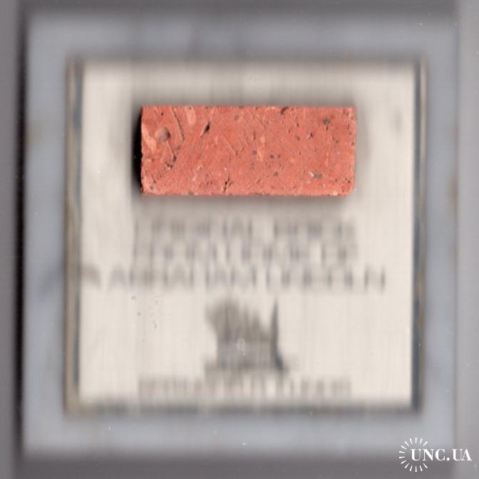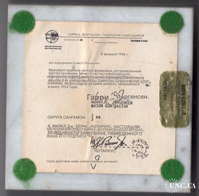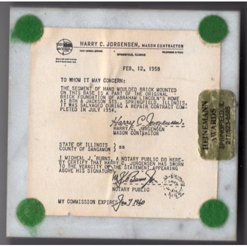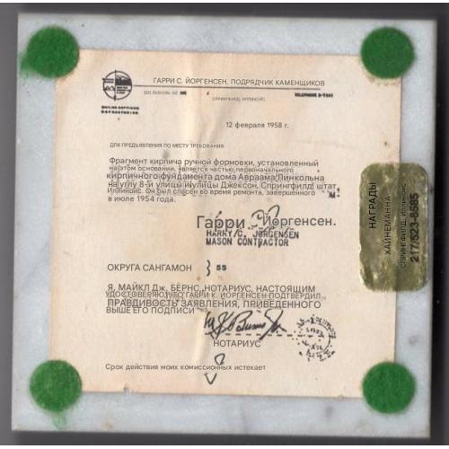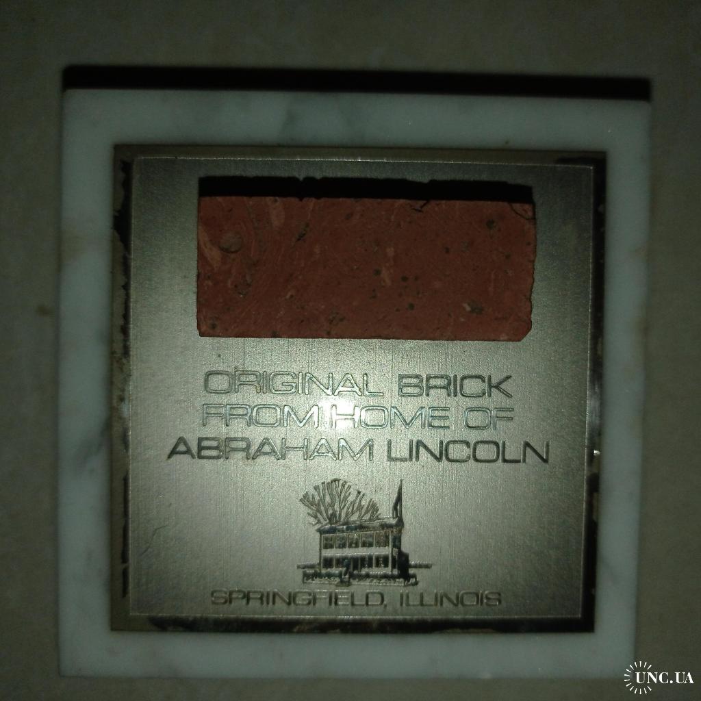 оригинальный кусок кирпича из фундамента дома Линкольна на подставке.