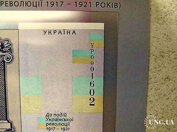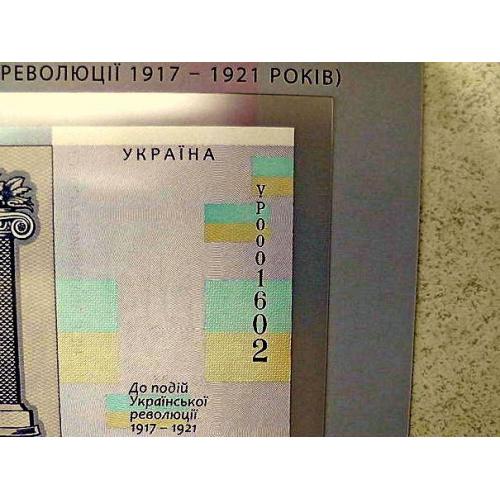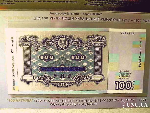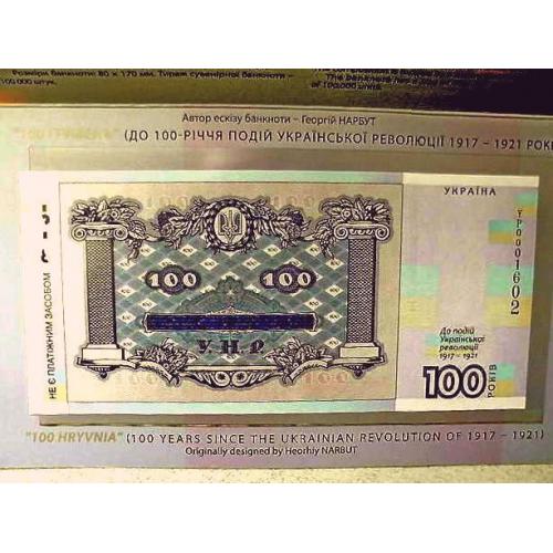 Сувенірна банкнота `Сто гривень` відтворює дизайн української банкноти номінальною вартістю 100 гривень, введеної в обіг 17 жовтня 1918 року. Навесні 1918 року український уряд ухвалив рішення змінити назву вітчизняних грошей із `карбованців` на `гривні`, бажаючи підкреслити спадковість традицій державотворення з часів Київської Русі. Найціннішою з мистецького погляду була купюра номіналом 100 гривень, розроблена і виконана Г. Нарбутом, на якій зображено пишний вінок із квітів, плодів, овочів, пшениці. Обабіч стоять жінка в національному вбранні зі снопом пшениці та серпом у руці і чоловік у фартуху, що спирається на молот, обвитий лавром. Написи зворотного боку включено у великий картуш із рослинно-плодового орнаменту, а по боках - декоративні колони. Увінчує всю композицію тризуб, обрамлений лавровим вінком. Банкнота виготовлена на папері з водяним знаком (зображення тризуба). Її розміри: 80 х 170 мм.