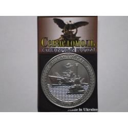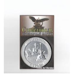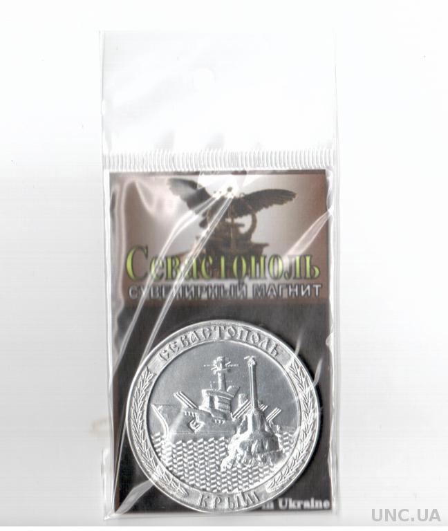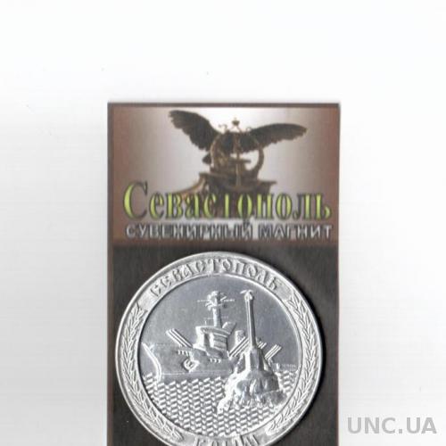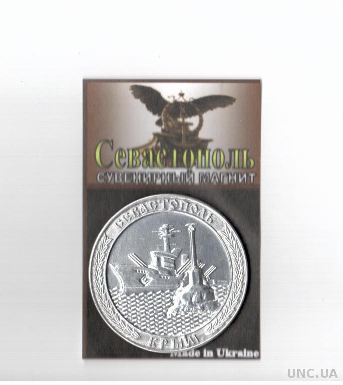 Сувенирный магнит, посвященный городу Севастополю, с изображением памятника затопленным кораблям в период первой обороны 1855-1856г.г. и линкора "Севастополь", принимавшему участие во второй обороне города и Крыма 1941-1943г.г.