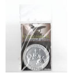 Штамповка из алюминиевого сплава в виде медали (монеты) диаметром 50 мм, полированный, в оригинальной упаковке с презентационным вкладышем. Штамповка изображения - только на лицевой стороне, на тыльной - полоска магнита для крепления на холодильник, сейф и т. д.