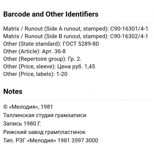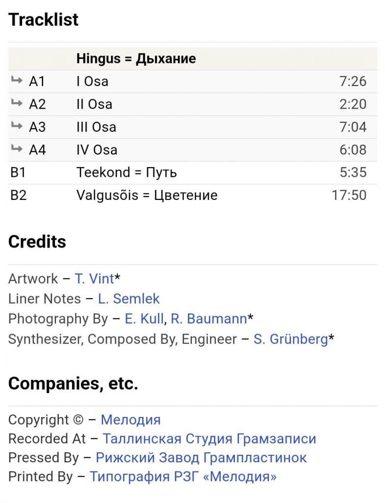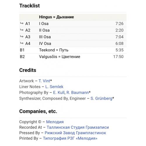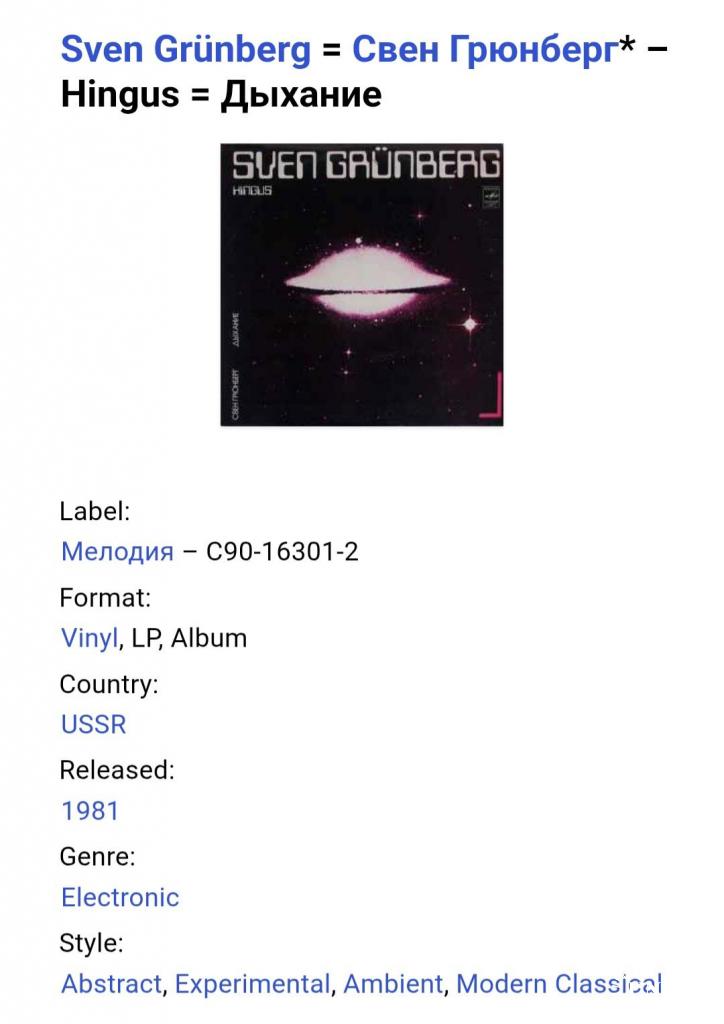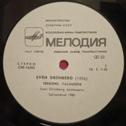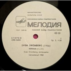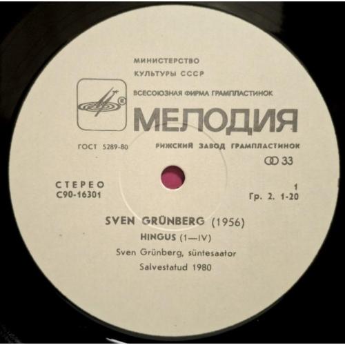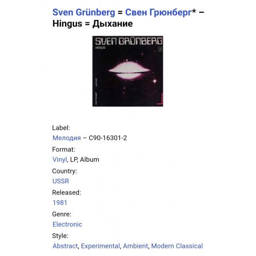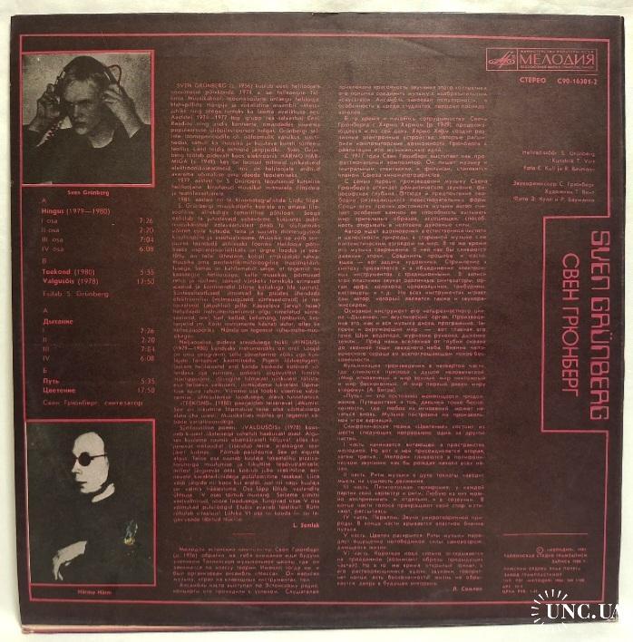 Вінілова платівка. Другий, в дискографії, студійний альбом Естонського композитора Шведського походження, виконавця стилю абстракт, експерементальна електронна музика, Свена Грюнберга (Подих) 1980. Випуск фірми (Мелодія) СРСР, Рижський завод грамплатівок (Латвія) 1981-ий рік. Оригінальне першопресове видання. Стан платівки NM-.Стан конверту NM-. Відправка по Україні службами доставки: Нова Пошта, Укр Пошта, Делівері. Також відправляємо посилки за кордон по цілому світу.