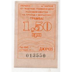 Талон 1 грн 50 коп Трамвай Харьков оранжевый / проездной билет