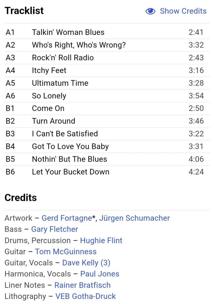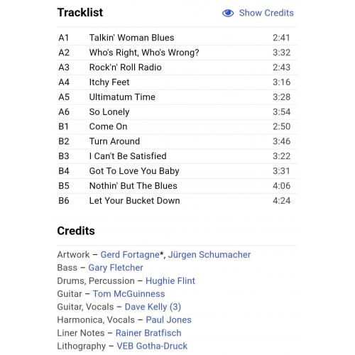 1981-2000Вінілова платівка. Третій, в дискографії, студійний альбом, Британської блюз-рок групи The Blues Band, до складу якої на той час входили Пол Джонс, Дейв Келлі, Гарі Флетчер, Том МакГіннес, Роб Таунсенд та Х'ю Флінт (Itchy Feet) 1981. Випуск фірми (Amiga) DDR, 1984-ий рік. Стан платівки NM-/EX+. Стан конверту ЕХ+. Відправка по Україні службами доставки: Нова Пошта, Укр Пошта, Делівері. Також відправляємо посилки за кордон по цілому світу.