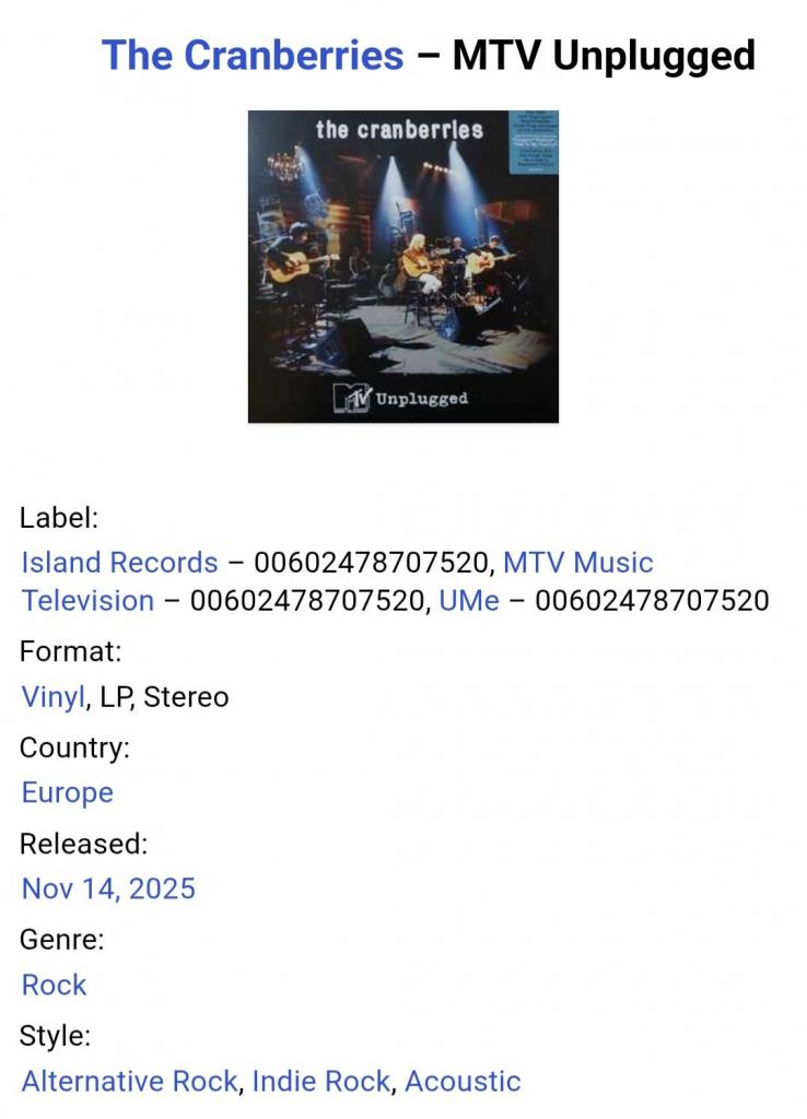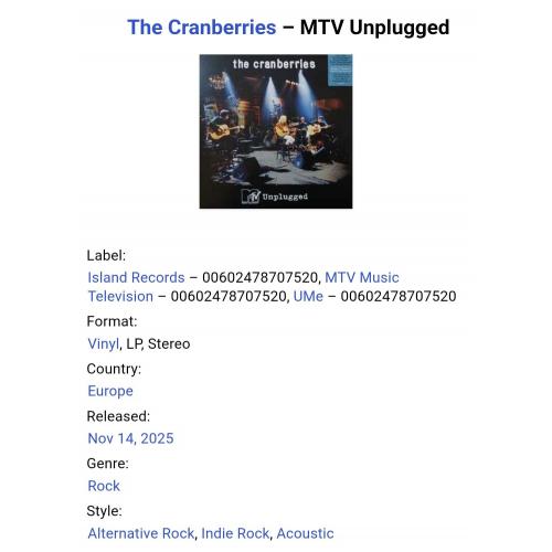 Вінілова платівка. Вперше на вінілі, живий виступ в рамках промоакції альбому No Need To Argue у програмі MTV, який досі ніколи не був опублікований, Ірландської кельтик-рок, дрім-поп, софт-рок групи The Cranberries, який складався з учасників Долорес О'Ріордан, Ноель Хоган, Майк Хоган, Фергал Лоулер та Ніалл Куїнн (MTV Unplugged) 1995. Випуск фірми (Island Records / MTV Music Television / UMe) Europe, 2025-ий рік. Лімітований тираж (Limited Edition). Видання нове, запаковане. Категорія S/S. Відправка по Україні службами доставки: Нова Пошта, Укр Пошта, Делівері. Також відправляємо посилки за кордон по цілому світу.