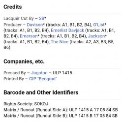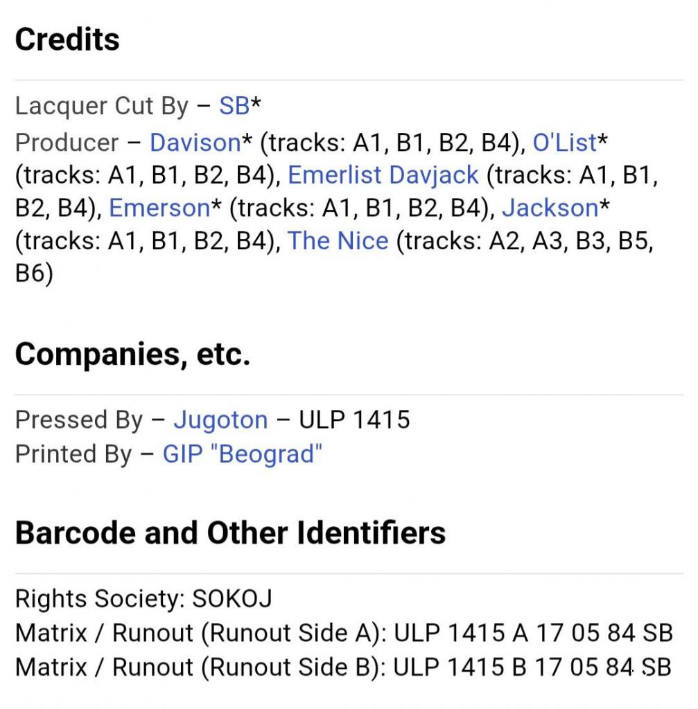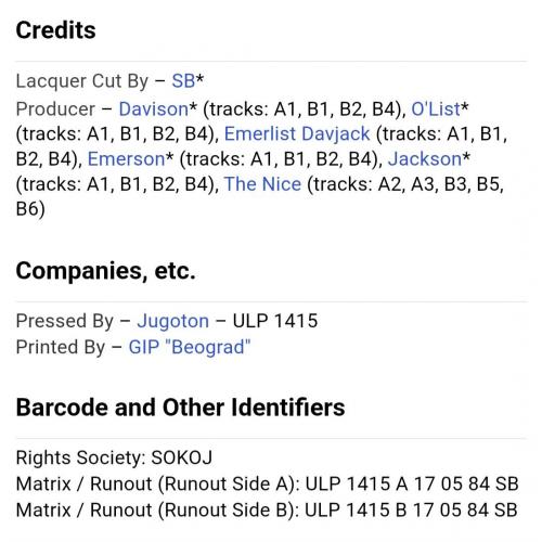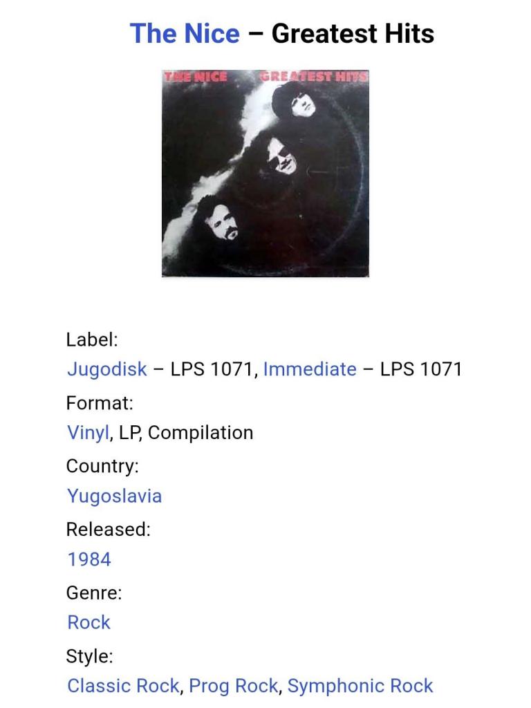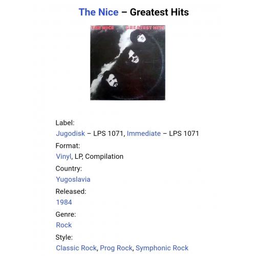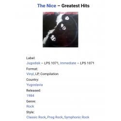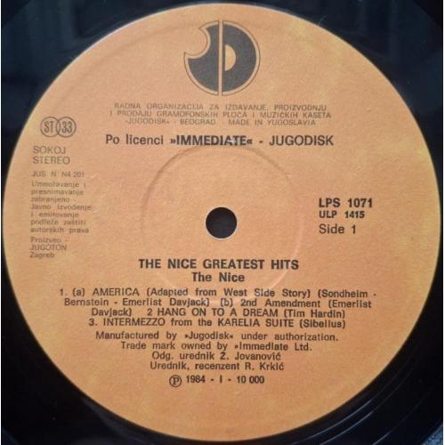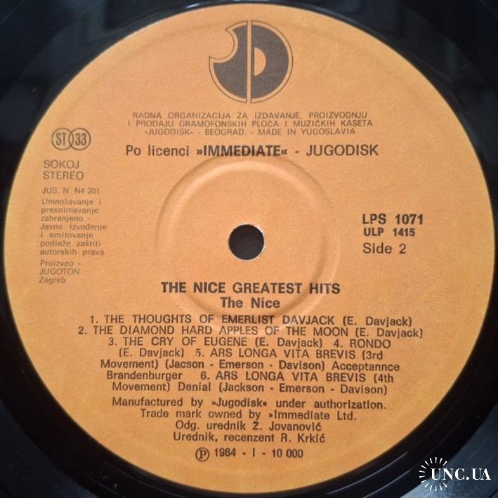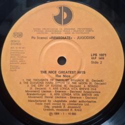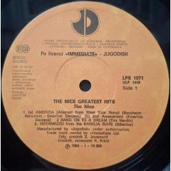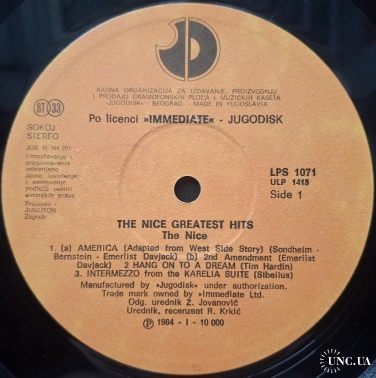 Вінілова платівка. Офіційна збірка найкращих хітів, яка вперше була випущена в 1977-му році, Британської прог-рок, психоделик-рок групи The Nice, до складу якої входили музиканти Кіт Емерсон, Лі Джексон, Брайян Девідсон та Девід О'Ліст (Greatest Hits) 1968-71. Випуск фірми (Jugodisk / Immediate) Yugoslavia, 1984-ий рік. Оригінальне, Югославське видання. Стан платівки ЕХ+. Стан конверту EX+. Відправка по Україні службами доставки: Нова Пошта, Укр Пошта, Делівері. Також відправляємо посилки за кордон по цілому світу.