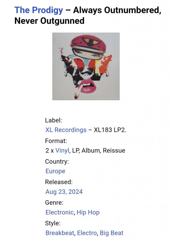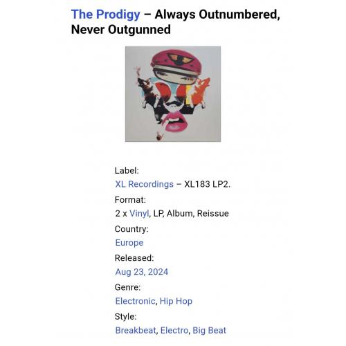 Вінілові платівки. Четвертий, в дискографії, студійний альбом, Британської електро панк, хардкор, рейв групи The Prodigy, до складу якої, на той час, входили учасники Ліам Гаулетт, Максим Реаліті та Кіт Флінт (Always Outnumbered, Never Outgunned) 2004. Випуск фірми (XL Recordings) Europe, 2024-ий рік. Видання з двох платівок (2LP). Нове, запаковане. Категорія S/S. Відправка по Україні службами доставки: Нова Пошта, Укр Пошта, Делівері. Також відправляємо посилки за кордон по цілому світу.