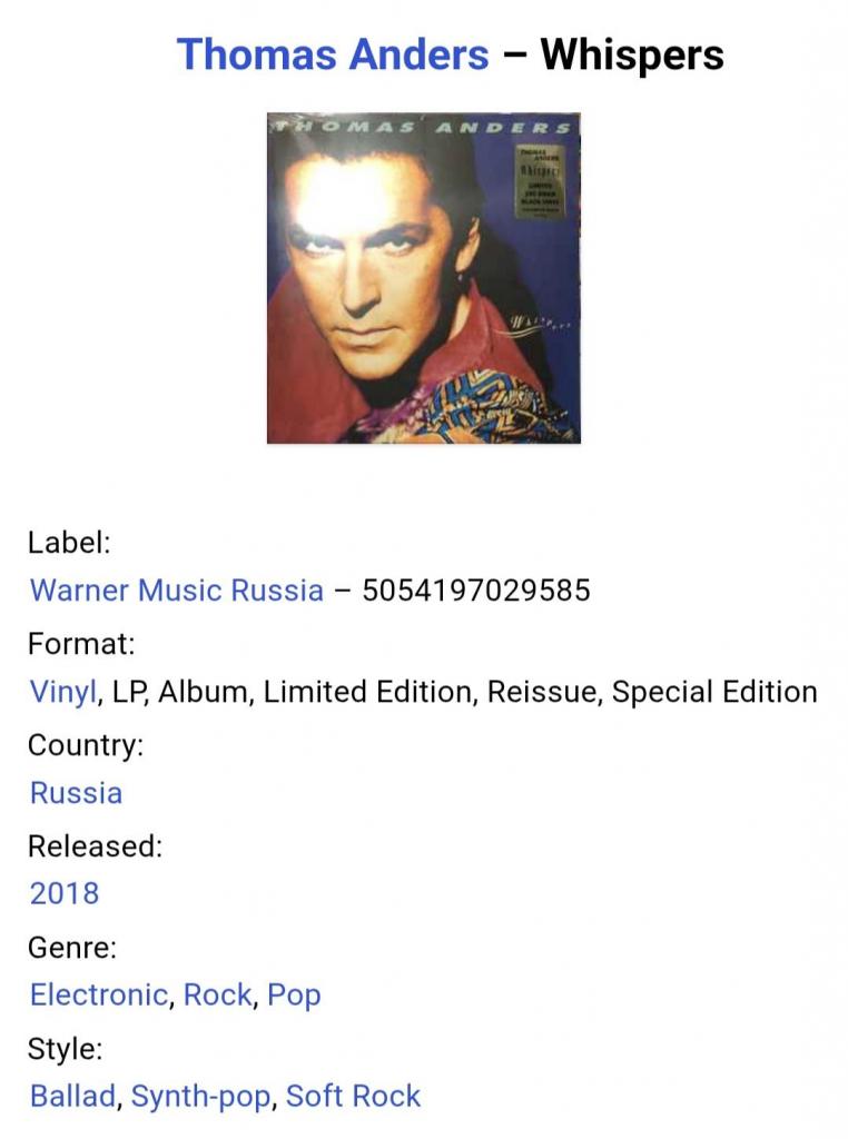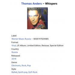 Вінілова платівка. Другий, в дискографії, сольний студійний альбом, Німецького поп виконавця, бувшого вокаліста легендарної групи Модерн Токінг, Берндта Вайдунга, більше відомого під сценічним ім'ям Томас Андерс (Whispers) 1991. Випуск фірми (Warner Music) Russia, 2018-ий рік. Спеціальне видання(Special Edition). Лімітований тираж (Limited Edition). Нове, запаковане. Категорія S/S. Відправка по Україні службами доставки: Нова Пошта, Укр Пошта, Делівері. Також відправляємо посилки за кордон по цілому світу.