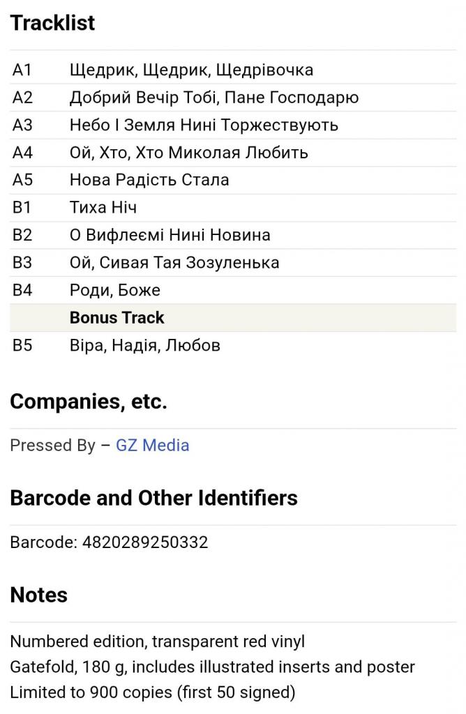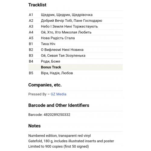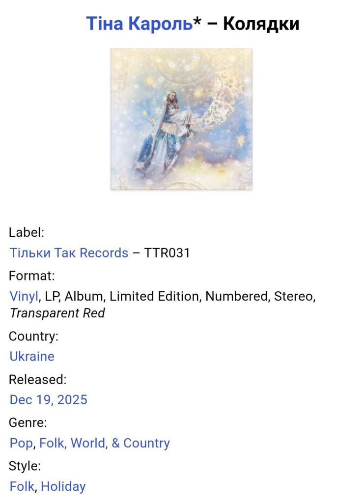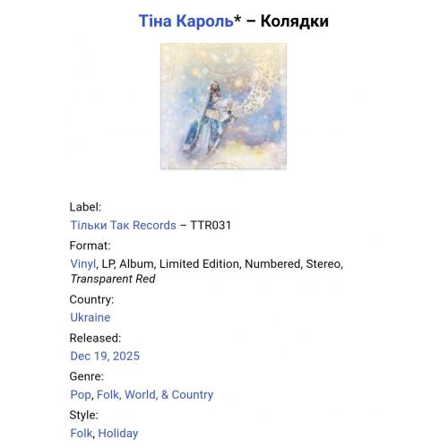 Вінілова платівка. Дев'ятнадцятий, в дискографії, студійний, Різдв'яний альбом, Української поп-виконавиці, Народної артистки України, володарки титулу Ордена святої великомучениці Єкатерини, Тетяни Ліберман, більше відомої під сценічним ім'ям Тіна Кароль (Колядки) 2025. Випуск фірми (Тільки Так Records) Ukraine, 2025-ий рік. Оригінальне, першопресове видання. Кольоровий вініл (Coloured Vinyl). В комплекті Різдв'яний постер та Різдв'яні відкритки. Лімітований тираж (Limited Edition). Нове, запаковане. Категорія S/S. Відправка по Україні службами доставки: Нова Пошта, Укр Пошта, Делівері. Також відправляємо посилки за кордон по цілому світу.