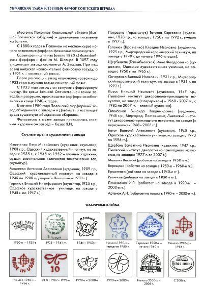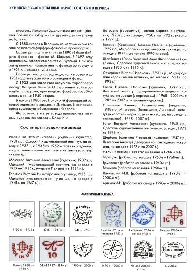 Каталог "Украинский художественный фарфор советского периода" содержит информацию о фарфоровых заводах Украины, их марках, ведущих скульпторах и художниках этих предприятий советского и постсоветского периодов. Также представлены образцы художественного фарфора, изготовленные украинскими предприятиями время и ориентировочная стоимость изделий на середину 2008 года.
