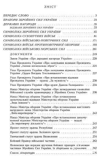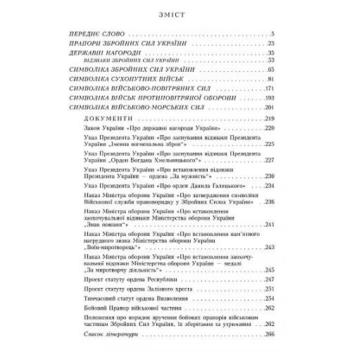 У книзі вперше висвітлюється система військових символів у сучасних Збройних Силах України. Представлені у цьому виданні прапори всіх видів Збройних Сил, державні та відомчі нагороди, знаки класної кваліфікації та нарукавні знаки військовослужбовців.