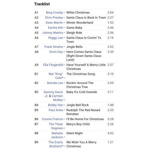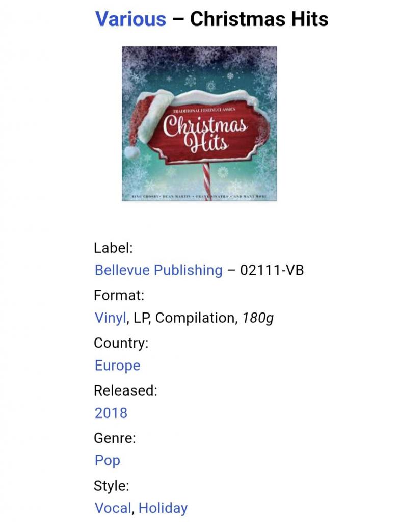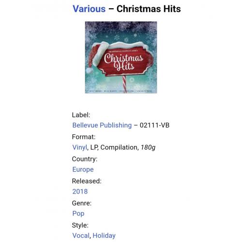 Вінілова платівка. Святкова збірка найпопулярніших Різдвяних хітів від світових музичних зірок таких як Elvis Presley, Frank Sinatra, Bing Crosby, Nat King Cole, Paul Anka, The Beverley Sisters, Dean Martin, Eartha Kitt, Peggy Lee, Brenda Lee, Johnny Mathis, Ray Connlf And The Singers, Connie Francis, Mahalia Jackson, The Everly Brothers, The Three Degrees, Sammy Davis Jr. & Carmen McRae, Bobby Vee, Ella Fitzgerald, Doris Day (Christmas Hits) 2018. Випуск фірми (Bellevue Publishing) Europe, 2018-ий рік. Лімітований тираж (Limited Edition). Видання нове, запаковане. Категорія S/S. Відправка по Україні службами доставки: Нова Пошта, Укр Пошта, Делівері. Також відправляємо посилки за кордон по цілому світу.