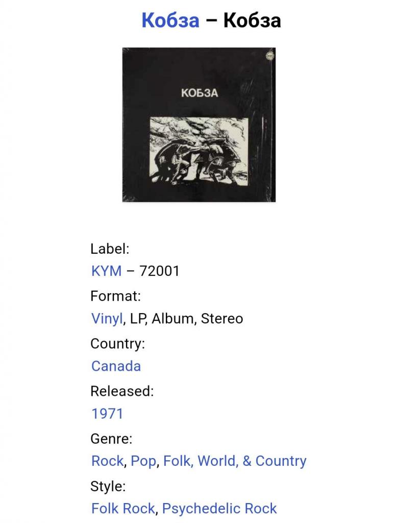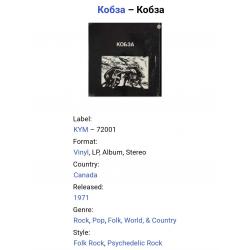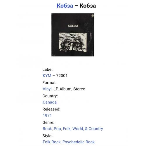 1961-1980Вінілова платівка. Перший, дебютний, студійний каталожний альбом Українського (радянського) фольк-рок, вокально інструментального ансамблю Кобза (Кобза) 1971. Випуск фірми (KYM) Canada 1971-ий рік. Оригінальне, першопресове Канадське видання. Рідкісне (Rare). Стан платівки ЕХ+/EX-. Стан конверту ЕХ+. Відправка по Україні службами доставки: Нова Пошта, Укр Пошта, Делівері. Також відправляємо посилки за кордон по цілому світу.
