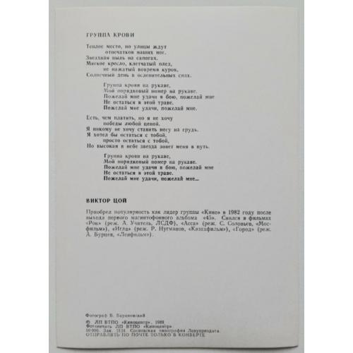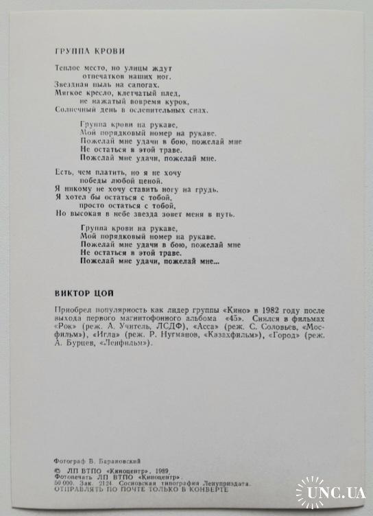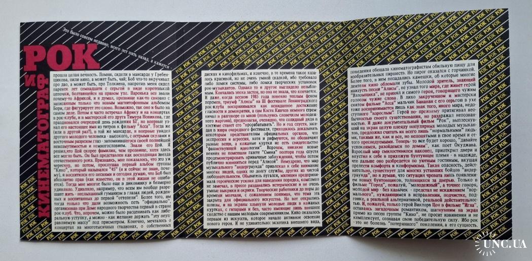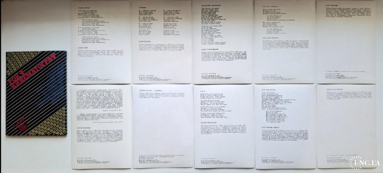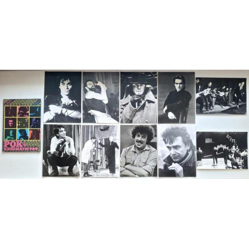Комплект відкриток радянських рок-зірок які проявили себе в кіно. В комплекті 10 двухсоронніх відкриток, з одного боку фото рок-зірки, з іншого коротка інформація та текс популярної пісні. До комплекту увійшли: Віктор Цой (група Кіно), Константин Кінчев (група Аліса), Борис Гребенщиков (група Акваріум), Юрій Шевчук (група ДДТ), Вячеслав Бутусов (група Наутілус Помпіліус), Андрій Макаревич (група Машина Часу), Антон Адосинський (група Авіа), Сергій Курьохін (група Поп Механіка), Сергій Бугаєв Африка (група Кіно та Група Поп Механіка), Олег Гаркуша (група Аукцион). Комплект під назвою (Рок и Кинематограф). Випуск : Союз Кінематографів СРСР, ЛП ВТПО (Киноцентр), Всесоюзне Мистецько-Творче Об'єднання Кіноцентр, Сосновська Типографія Ленуприздата, 1989-ий рік. Лімітований тираж (Limited Edition). Обкладинка-буклет. Розворотна на дві сторони. Комплект новий. Стан ідеальний. Зберігався бережно. Відправка по Україні службами доставки: Нова Пошта, Укр Пошта, Делівері. Також відправляємо посилки за кордон по цілому світу.