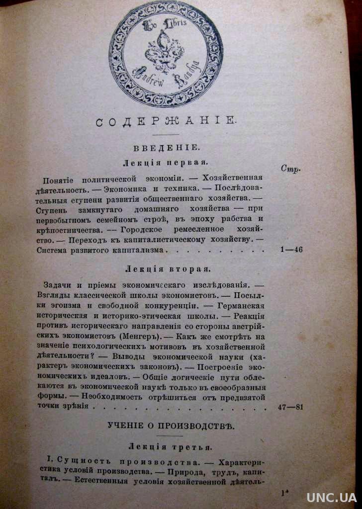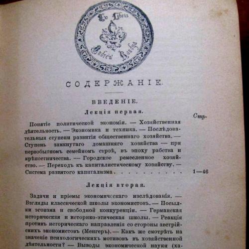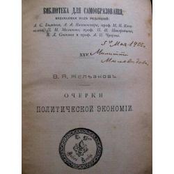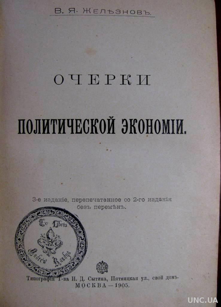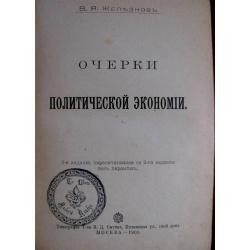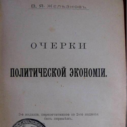 Перед Вами - оригинальное 3-е прижизненное издание 1905 года фундаментального курса «Очерки политической экономики» выпускника юридического факультета Киевского университета, профессора Владимира Яковлевича Железнова ( 1869 – 1933).Это наиболее известный труд ученого, который был создан в 1899 г. Второе издание вышло в свет в 1903 г. Фактически «Очерки» представляют собой исправленное и дополненное издание курса публичных лекций по политической экономии, читанных автором в 1898-1899 академическом году в Киевском университете. Подробно рассматриваются теоретические основы политической экономии; особое внимание уделено свободной конкуренции, частной монополии, вопросам распределения денежного и кредитного обращения. Основные темы: деньги, торговля, потребление, рабочее законодательство, а также понятие распределения общественного дохода, заработной платы.