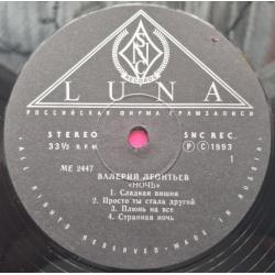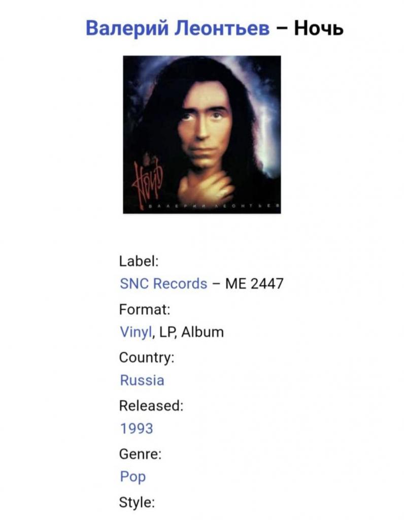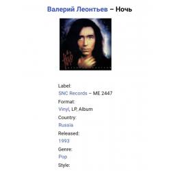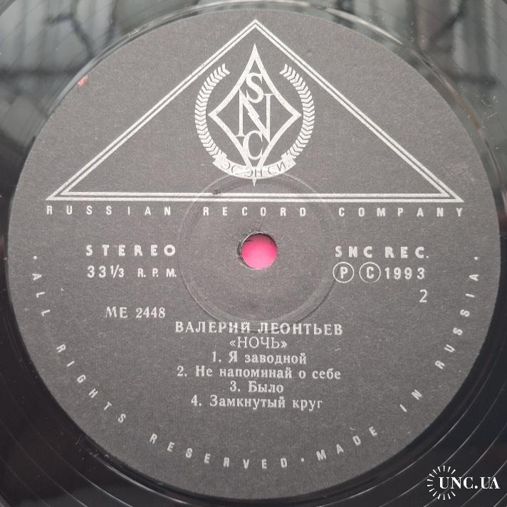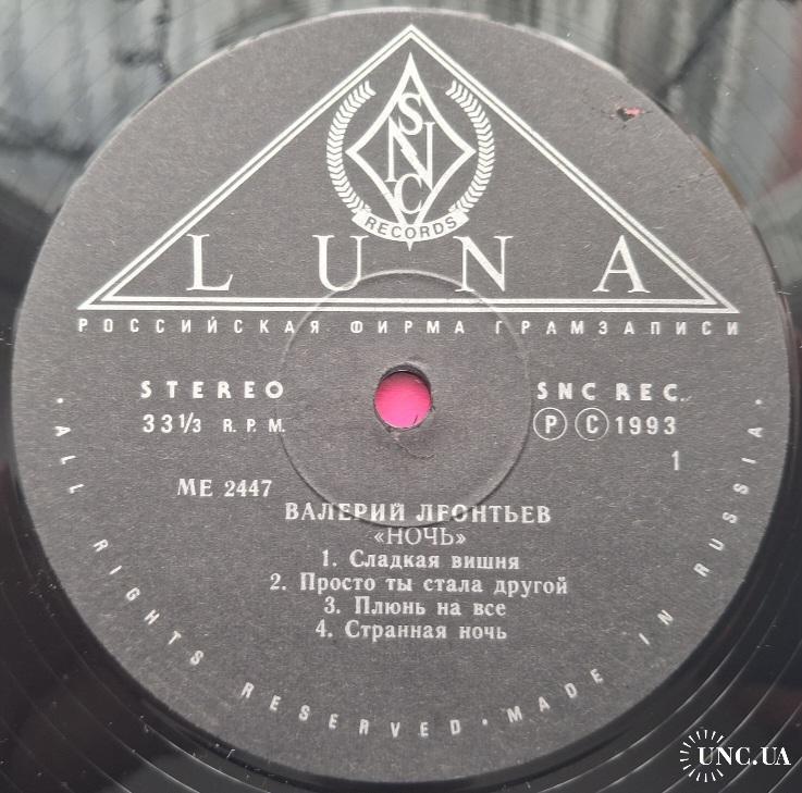 Вінілова платівка. Дев,ятий, в дискографії, студійний альбом, російського (радянського) поп-виконавця із Усть-Уса, Комі АРСР, Народного Артиста СРСР, Заслуженого артиста України, багаторазового володара Золотий Грамофон, Звукова Доріжка, Овації, Валерія Яковича Леонтьєва (Ночь) 1993. Випуск фірми (SNC Records Luna) Russia, 1993-ій рік. Оригінальне першопресове видання. Лімітований тираж (Limited Edition). Рідкісне (Rare). Стан платівки ЕХ+. Конверт ламінований. Стан конверту ЕХ+. Відправка по Україні службами доставки: Нова Пошта, Укр Пошта, Делівері. Також відправляємо посилки за кордон по цілому світу.