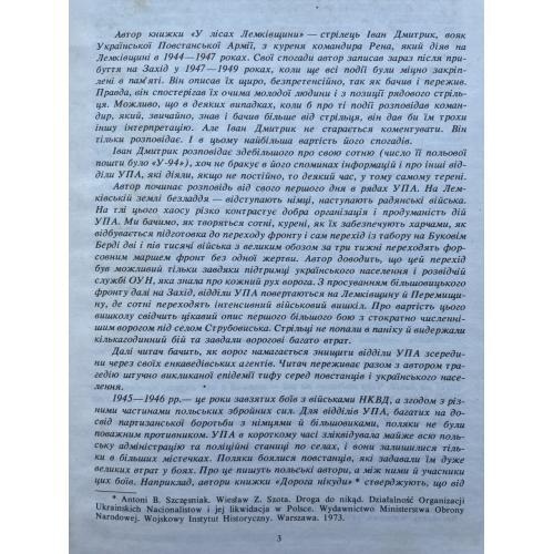Автор книжки "У лісах Лемківщини" - стрілець Іван Дмитрик, вояк Української Повстанської Армії УПА з куреня командира Рена, який діяв на лемківщині в 1944 - 1947 роках. Свої спогади автор записав зараз після прибуття на захід у 1947 - 1949 роках, коли ще всі події були міцно закріплені в пам'яті. Він описав їх щиро, безпретензійно, так як бачив і пережив. Правда він спостерігав їх очима молодої людини і з позиції рядового стрільця. Можливо, що в деяких випадках, коли б про ті події розповідав командир, який, звичайно, знав і бачив більше від стрільця, він дав би їм трохи іншу інтерпретацію. Але Іван Дмитрик не старається коментувати. Він тільки розповідає. І в цьому найбільша вартість його спогадів.