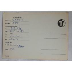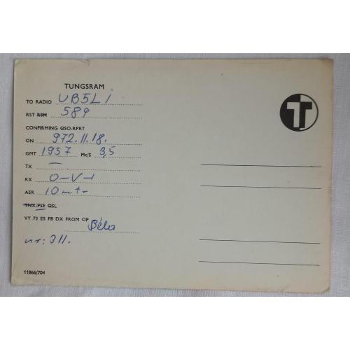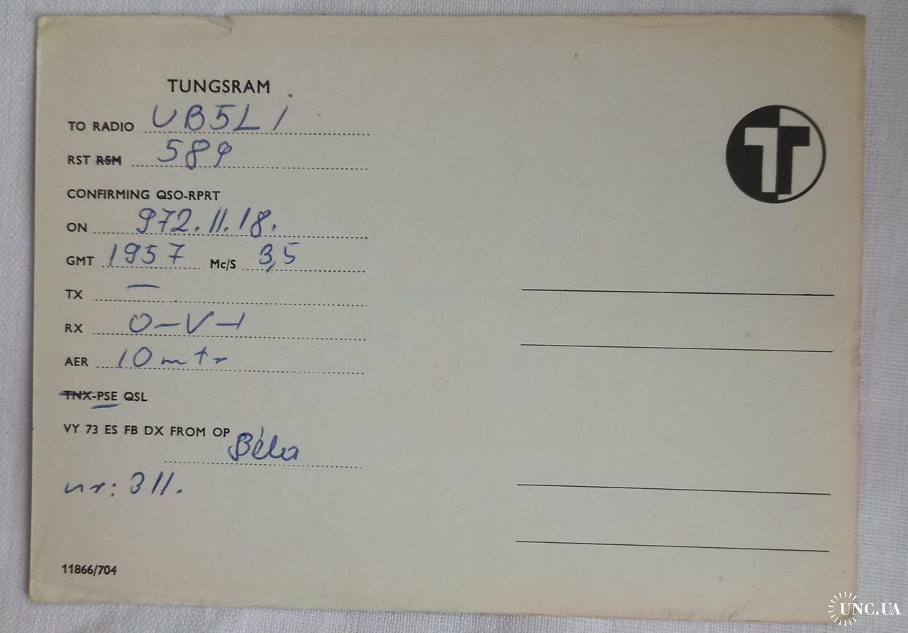 Использован бланк рекламной открытки компании TUNGSRAM,действовавшей с 1896 по 1990 год, как производитель ламп накаливания, радиоламп и полупроводниковых приборов. На лицевой стороне написан от руки позывной-сигнал венгерского радионаблюдателя (отличается от радиооператора тем, что он только наблюдает за радиообменом в эфире двух операторов и непосредственно в этом обмене не участвует, как правило это начинающие радисты-любители, т.н. SWL-shortwavelistener). На обратной стороне данные радиообмена в эфире и справа вверху логотип компании TUNGSRAM. У карточки слегка примяты уголки, но в целом состояние хорошее.