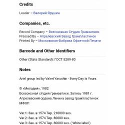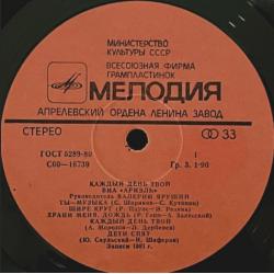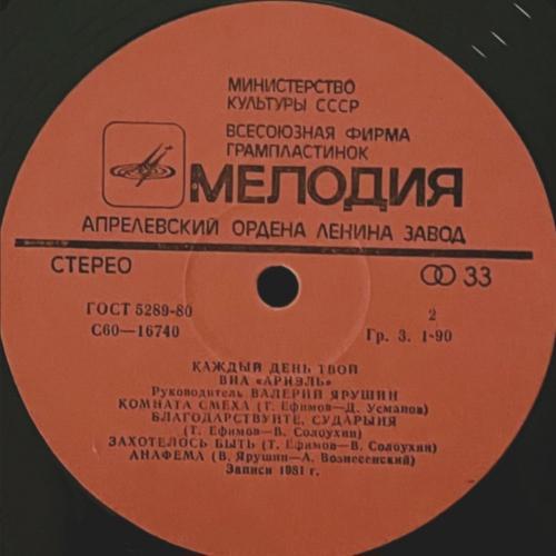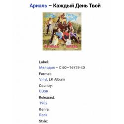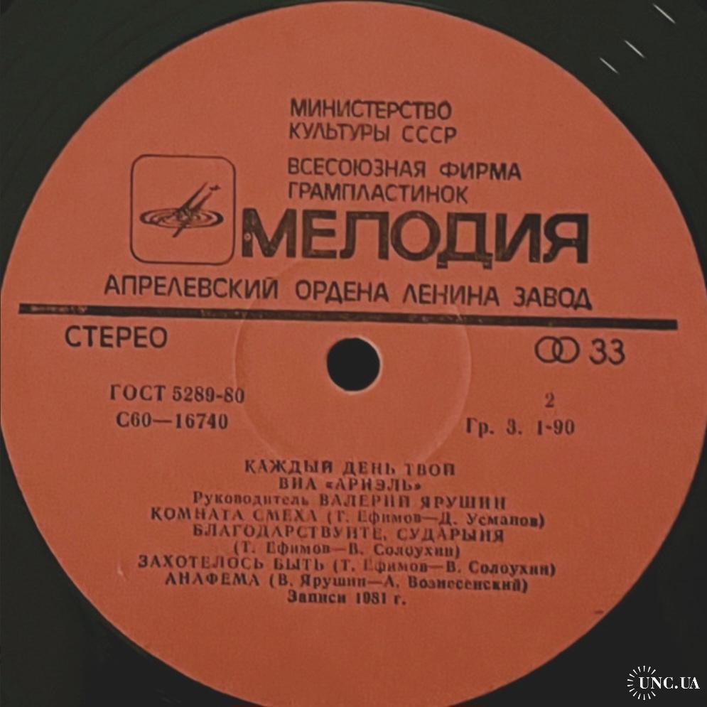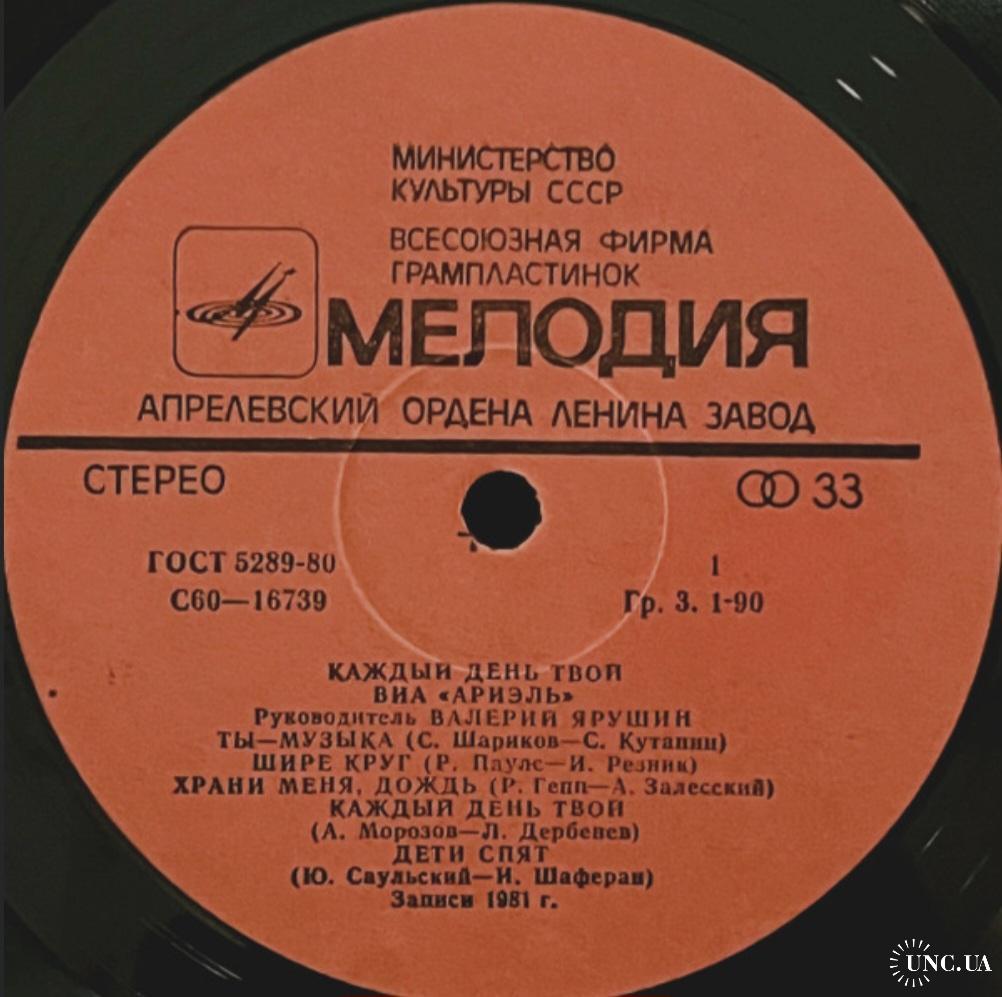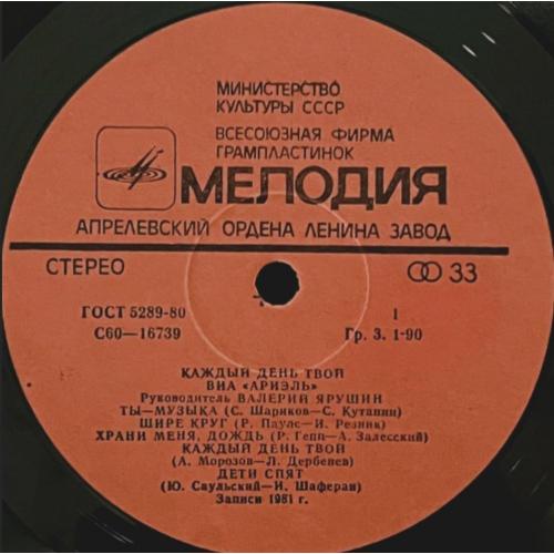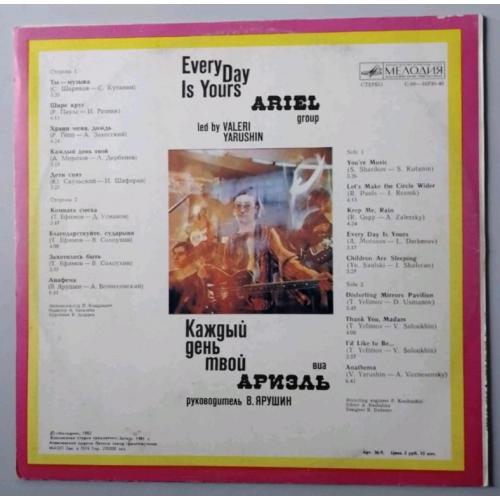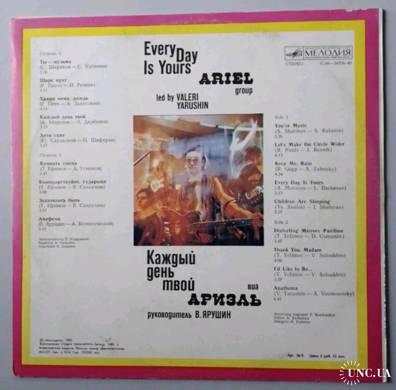 Вінілова платівка. Десятий, в дискографії, студійний альбом, російського (радянського) вокально інструментального ансамблю стилю , поп, рок, фанк, соул Аріель, до складу якого на той час входили учасники Олександр Іванов, Андрій Феофанов, Валерій Ярушин, Сергій Акімов, Олександр Трапезніков, Віктор Літвінов, Анатолій Літвінов, Борис Каплун, Ростислав Гепп, Олександр Тібеліус та Олег Гордєєв (Каждый День Твой) 1981. Випуск фірми (Мелодія) СРСР, Апрелєвський завод грамплатівок, 1982-ий рік. Оригінальне, першопресове видання. Стан платівки ЕХ+. Стан конверту ЕХ+. Відправка по Україні службами доставки: Нова Пошта, Укр Пошта, Делівері. Також відправляємо посилки за кордон по цілому світу.