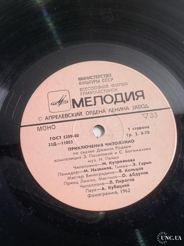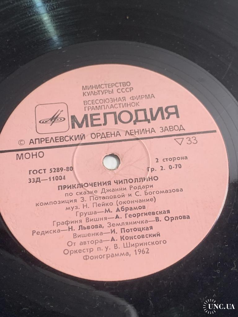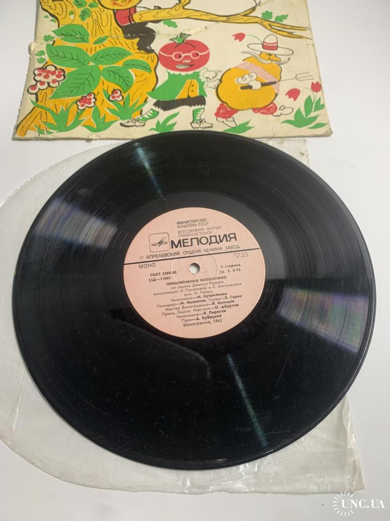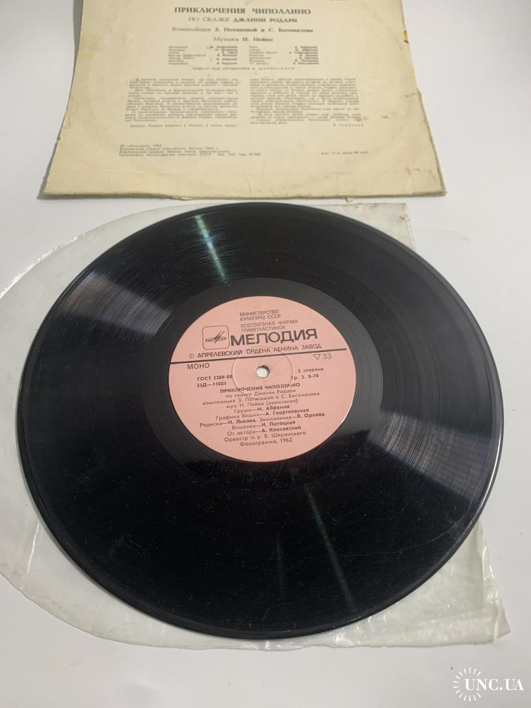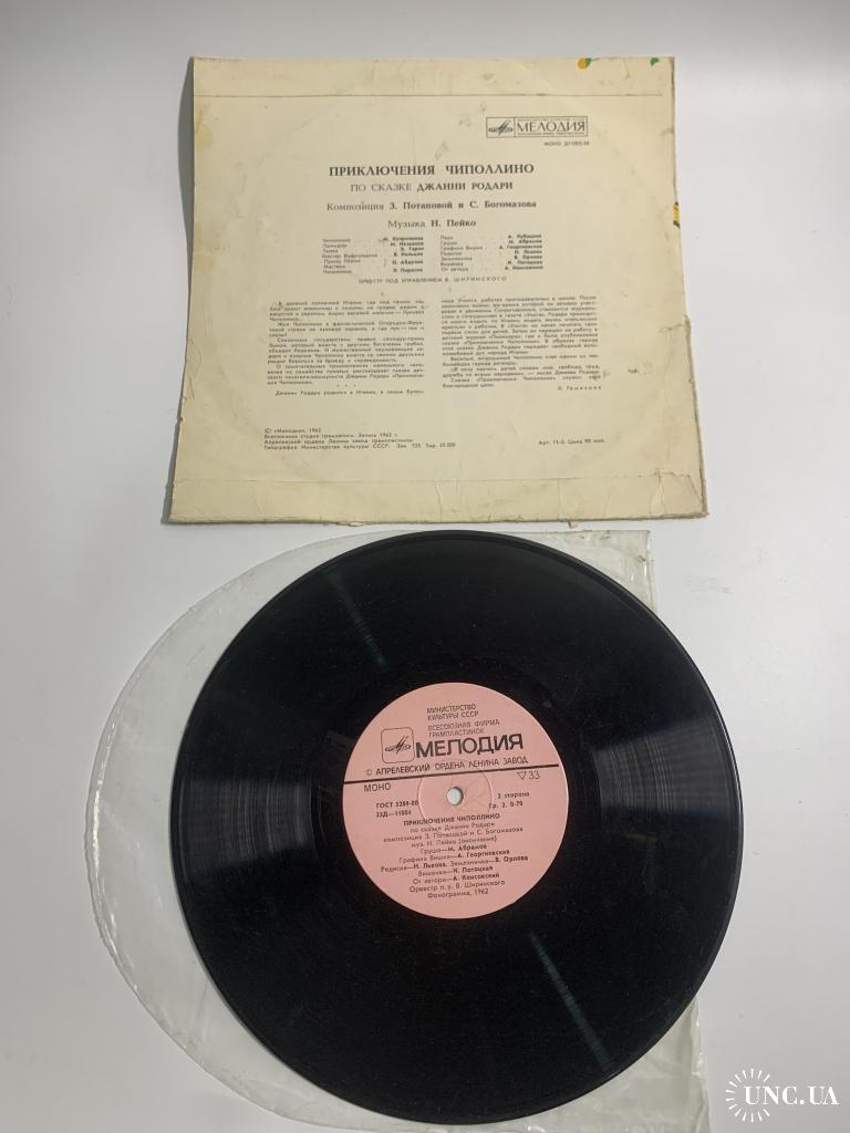 Редкая винтажная грамотка с литературно-музыкальной композицией по мотивам известной сказки Джанни Родари «Приключения Чиполлино». Издание выпущено всесоюзной фирмой «Мелодия» на заводе – одном из главных центров производства виниловых пластинок в СССР.