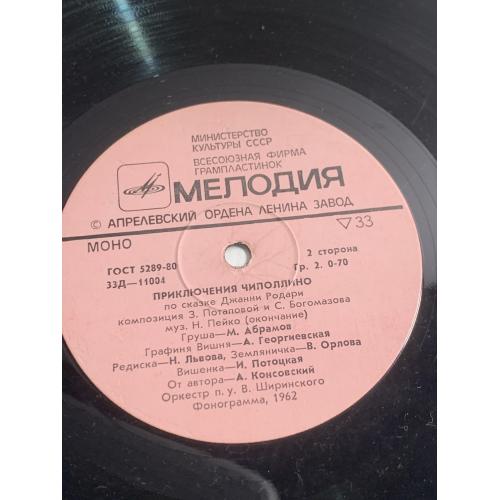 Виниловая пластинка аудиосказка "Приключения Чиполлино" Мелодия СССР 1962 г. 33Д-11003
