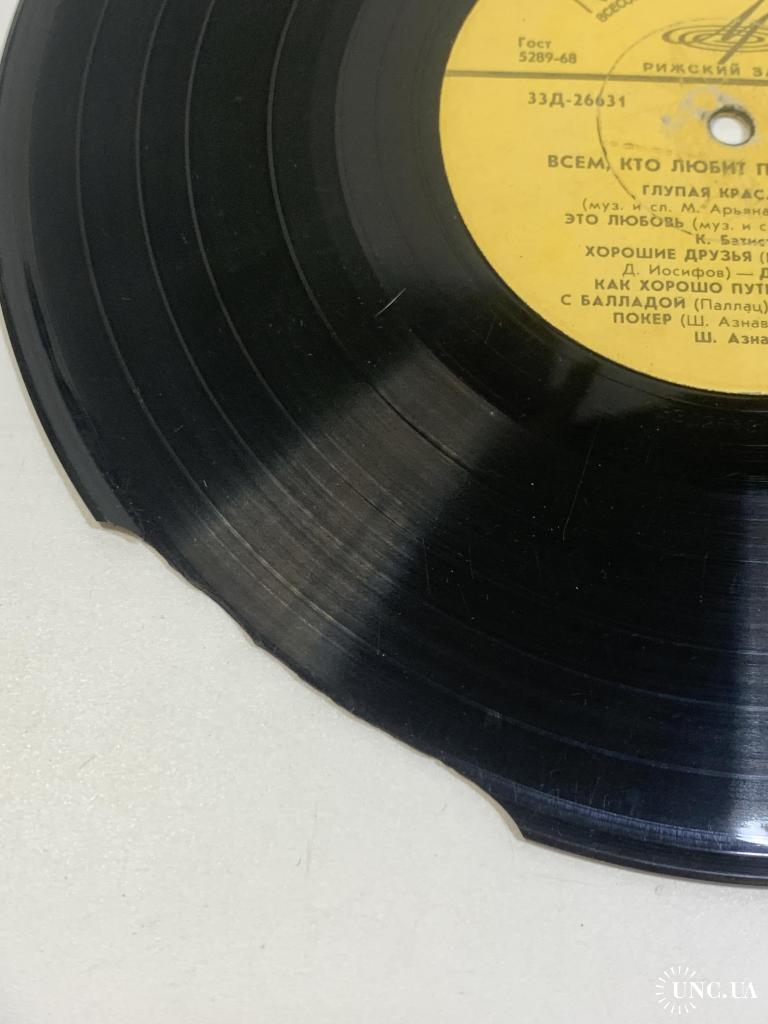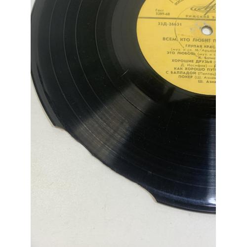 Винтажная советская грампластинка из известной серии «Всем, кто любит песню», выпущенная Всесоюзной фирмой «Мелодия» на Рижском заводе. Данный выпуск продолжает традицию музыкального сборника-хитпарада, в котором публиковались популярные композиции зарубежной и советской эстрады.