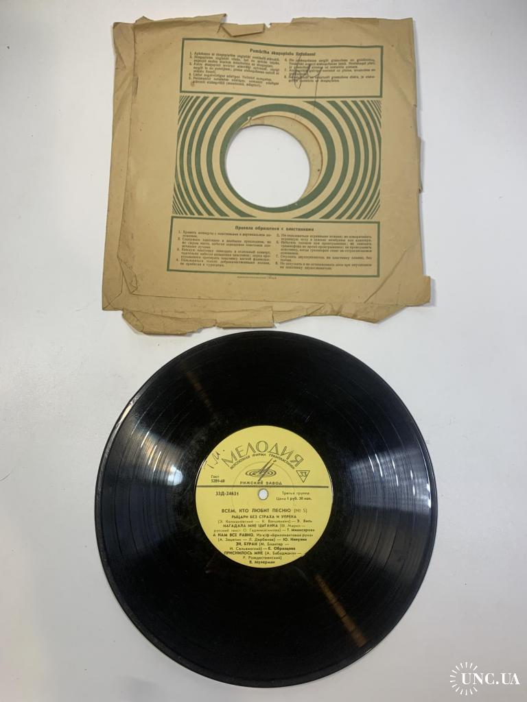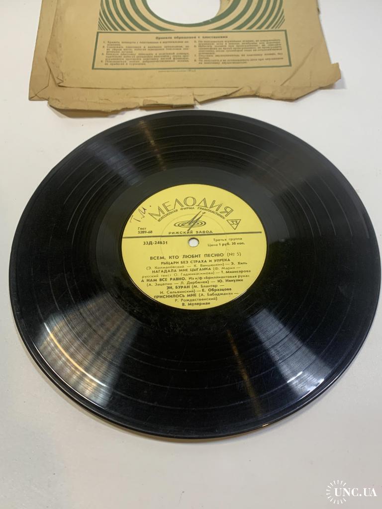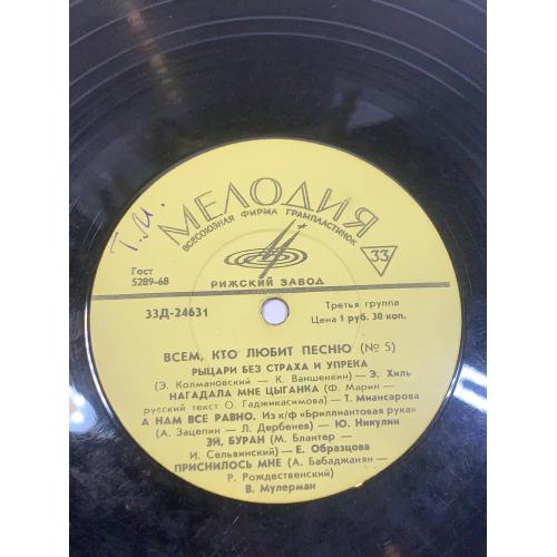 Винтажная советская грампластинка коллекционного издания «Всем, кто любит песню (№ 5)», выпущенная Всесоюзной фирмой «Мелодия» на Рижском заводе. Пластинка включает популярные композиции советских исполнителей 1960–1970-х годов, представляя разнообразие эстрадной музыки того времени. В сборник вошли песни Иосифа Кобзона, Нины Бродской, Льва Мондруса, Эдуарда Хиля, Юрия Никулина и других известных артистов.