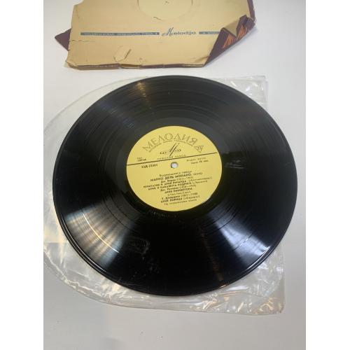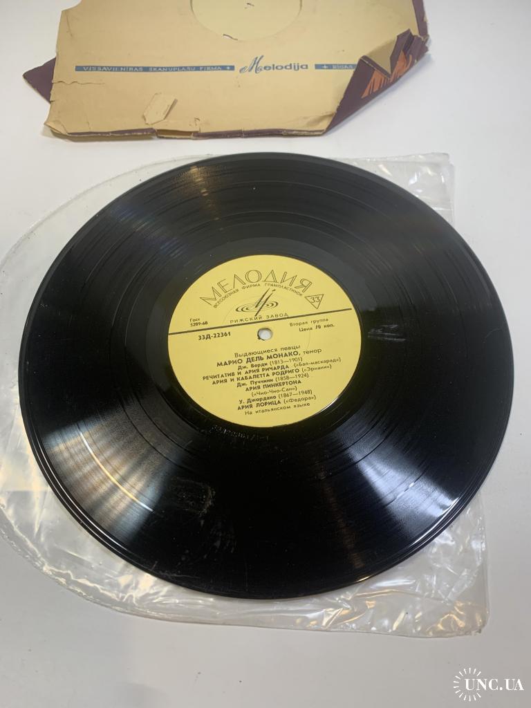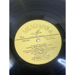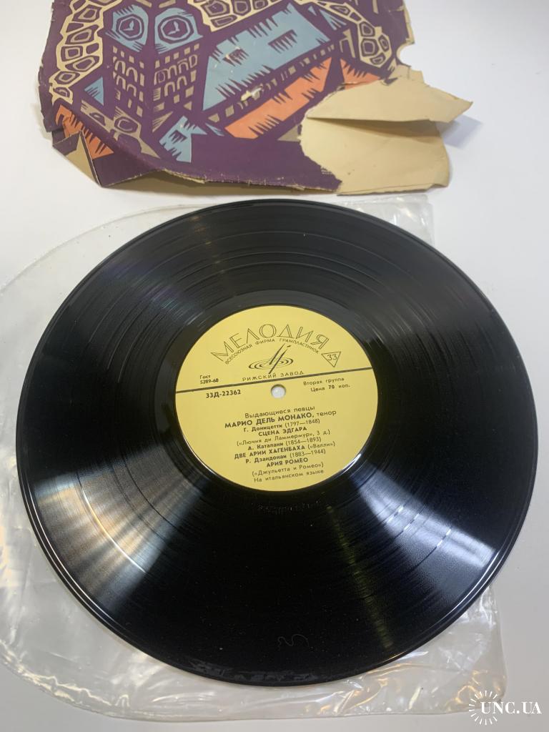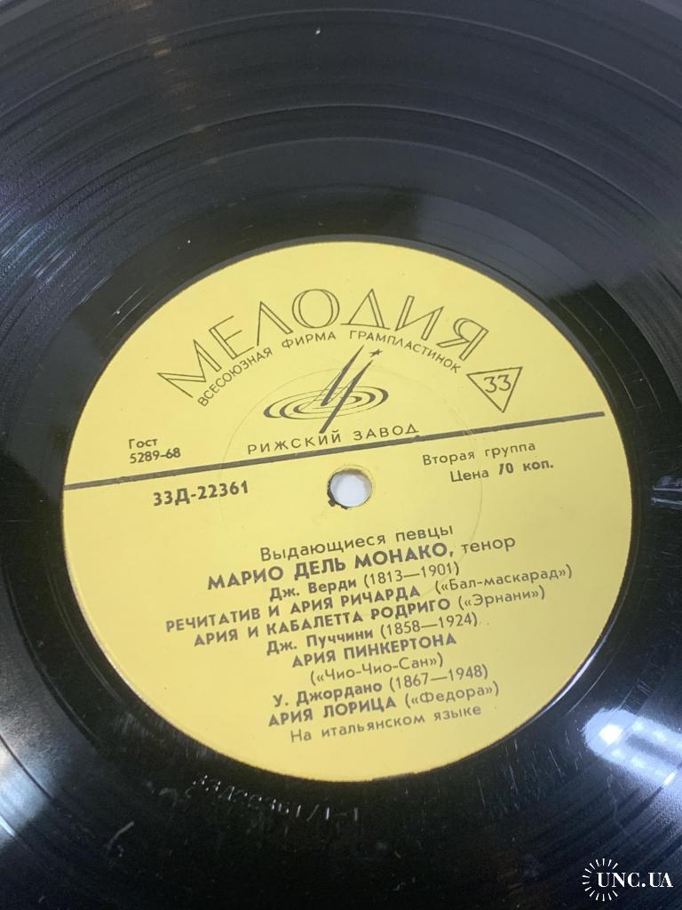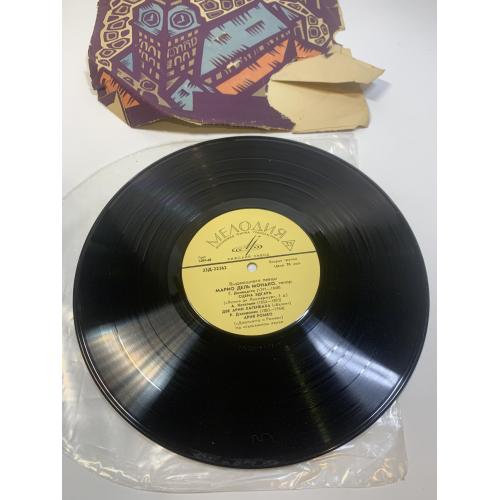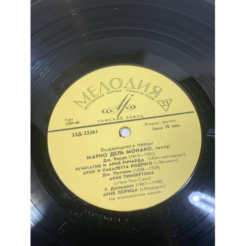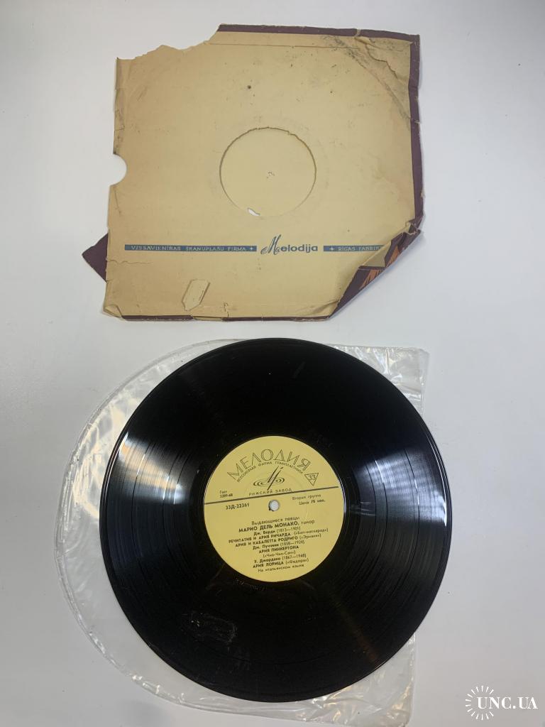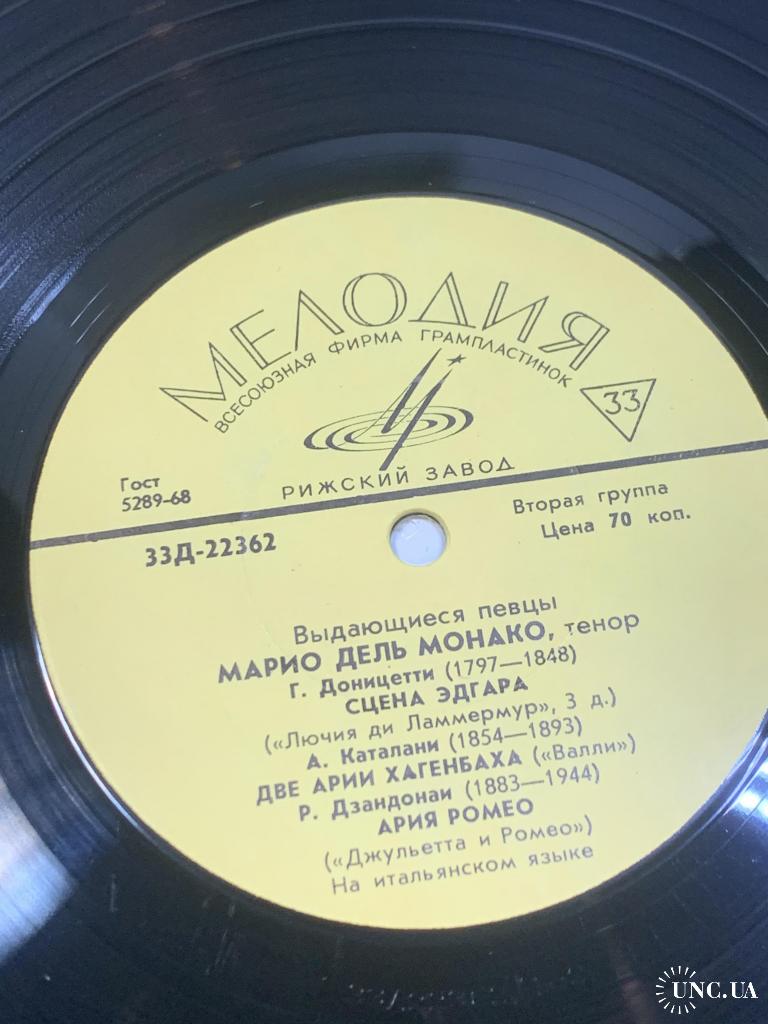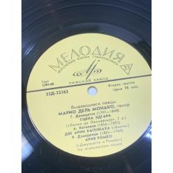 Винтажная советская грампластинка с записями оперных арий итальянского тенора Марио дель Монако, выпущенная Рижским заводом фирмы «Мелодия» в СССР. Пластинка содержит сцены и арии из знаменитых опер: «Лючия ди Ламмермур» (Доницетти), «Валли» (Каталани) и «Джульетта и Ромео» (Дзандонаи). Исполнение на итальянском языке с аккомпанементом оркестров, характерным для классического оперного звучания середины XX века.