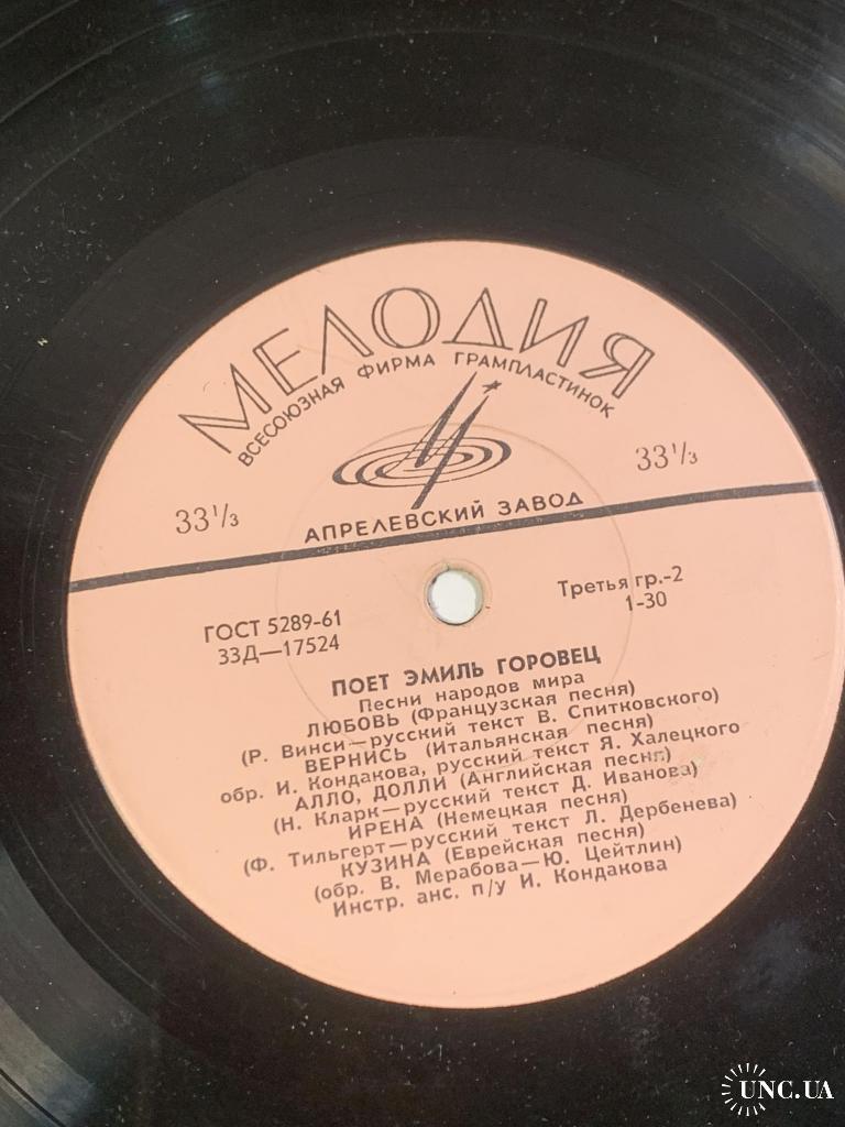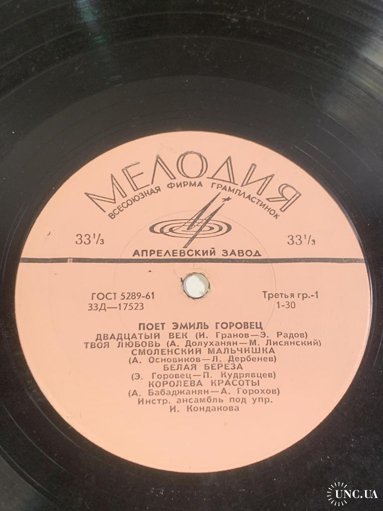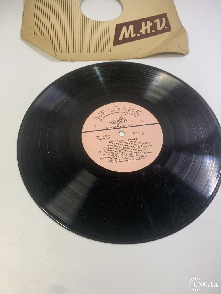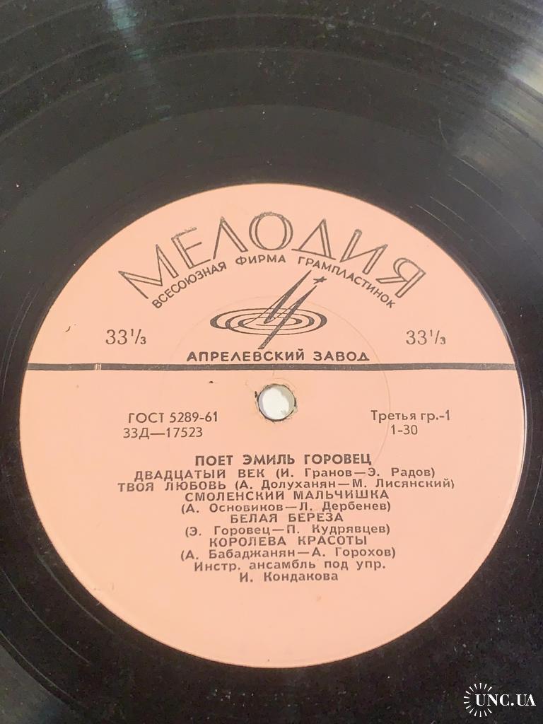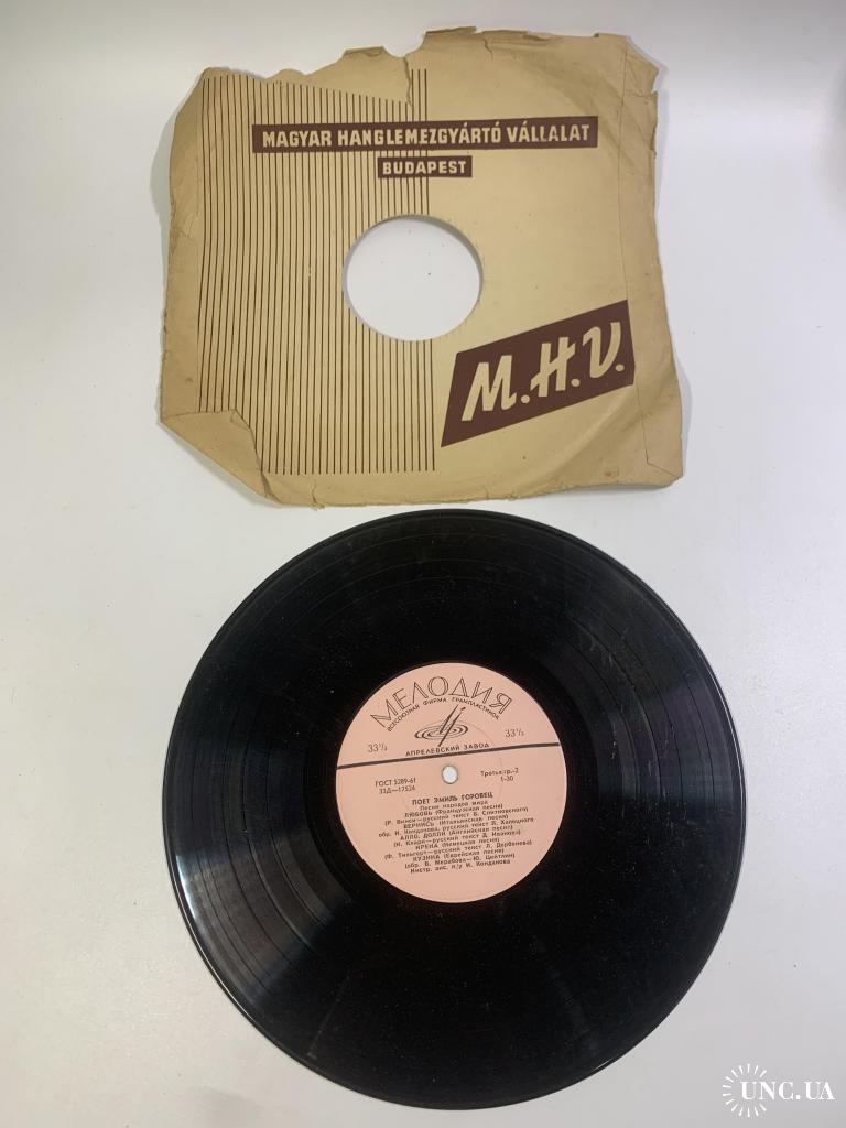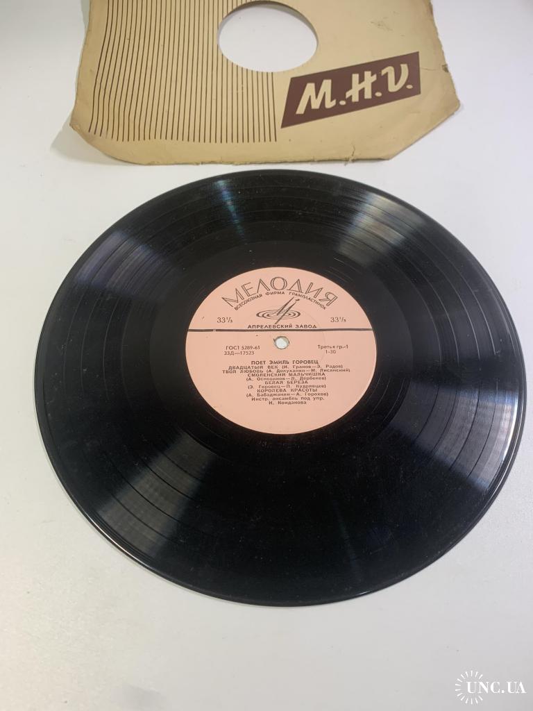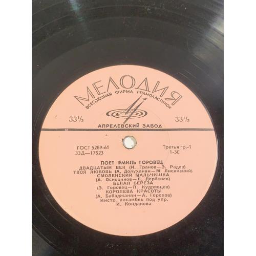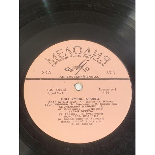 Винтажная грампластинка малого формата (миньон) с записями известного советского эстрадного певца Эмиль Горовец, одного из ярких представителей музыкальной культуры периода «оттепели». Пластинка выпущена Всесоюзной фирмой грамзаписи Мелодия на заводе грампластинок в середине 1960-х годов.