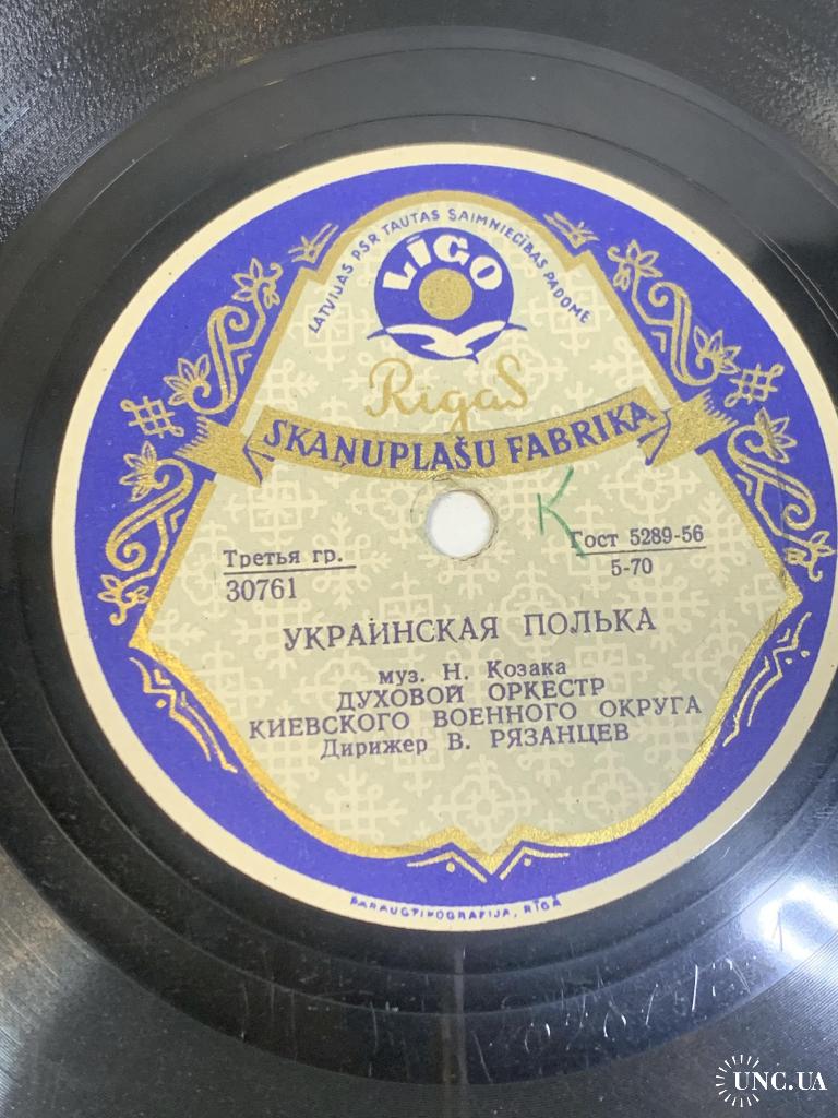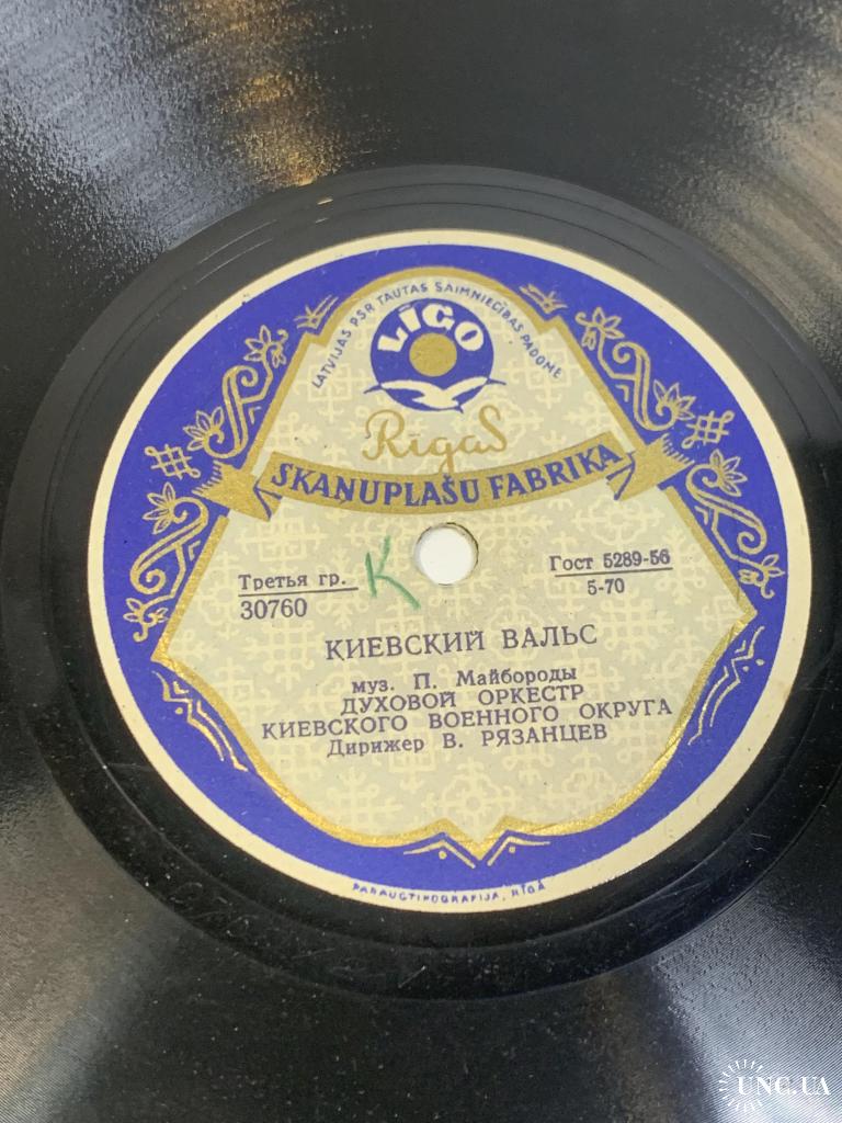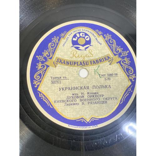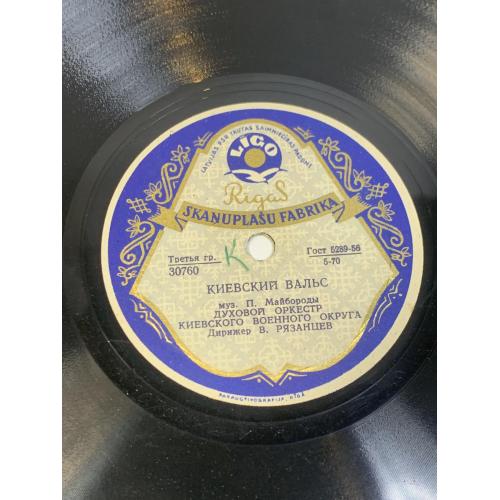 Винтажная советская грампластинка 1950-х годов, выпущенная Рижской фабрикой грампластинок. На пластинке записаны инструментальные произведения в исполнении духового оркестра Киевского военного округа под управлением В. Рязанцева — характерный пример военной и праздничной оркестровой музыки того времени.
