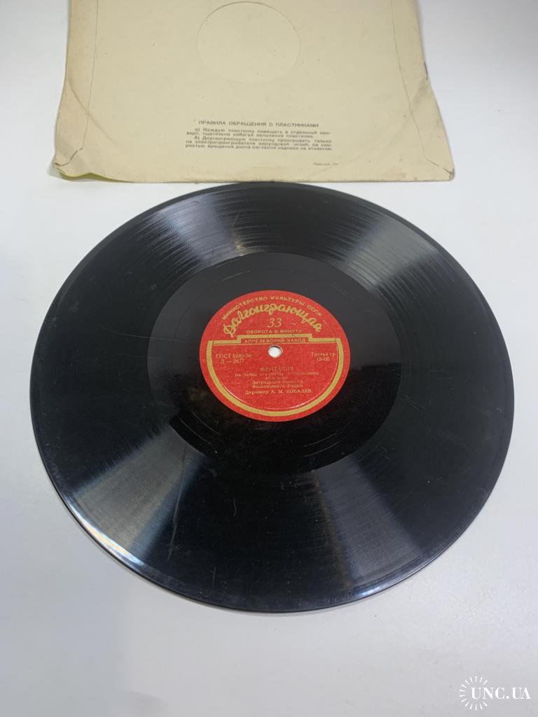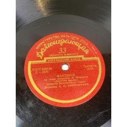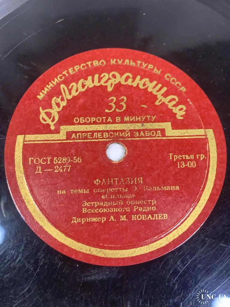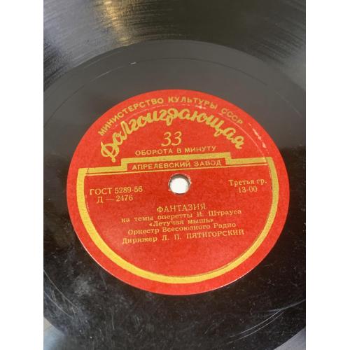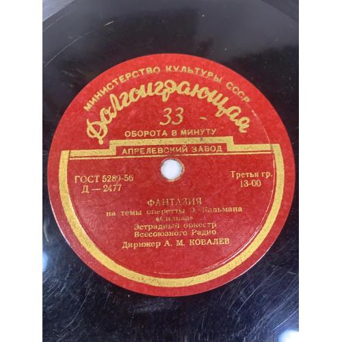 Винтажная долгоиграющая грампластинка советского производства с оркестровыми фантазиями на темы известных оперетт. Издание выпущено заводом грампластинок под контролем Министерство культуры СССР и соответствует стандарту ГОСТ 5289-56.