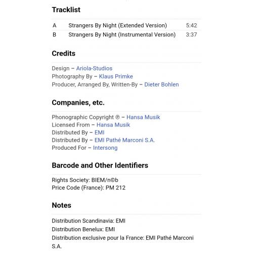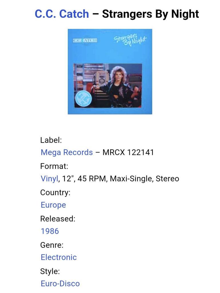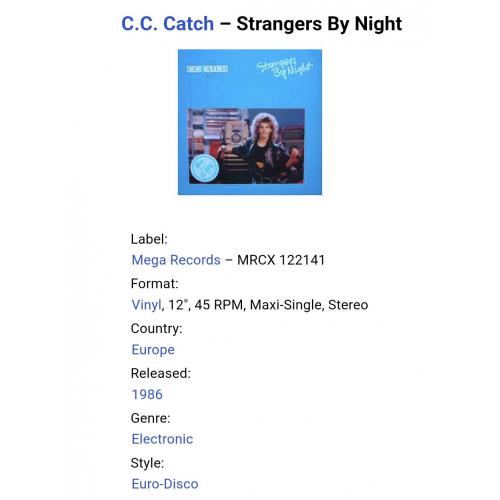 Вінілова платівка. Третій, в дискографії, студійний максі сингл (EP 12), легендарної Німецької виконавиці Голландського походження, стилю Євро Диско, Кароліни Катерини Мюллер, більше відомої під сценічним ім,ям C.C. Catch (Strangers By Night) 1986. Випуск фірми (Mega Records) EEC 1986-ий рік. Оригінальне, першопресове Європейське видання. Стан платівки EX+. Конверт глянцевий. Стан конверту ЕХ+. Відправка по Україні службами доставки: Нова Пошта, Укр Пошта, Делівері. Також відправляємо посилки за кордон по цілому світу.