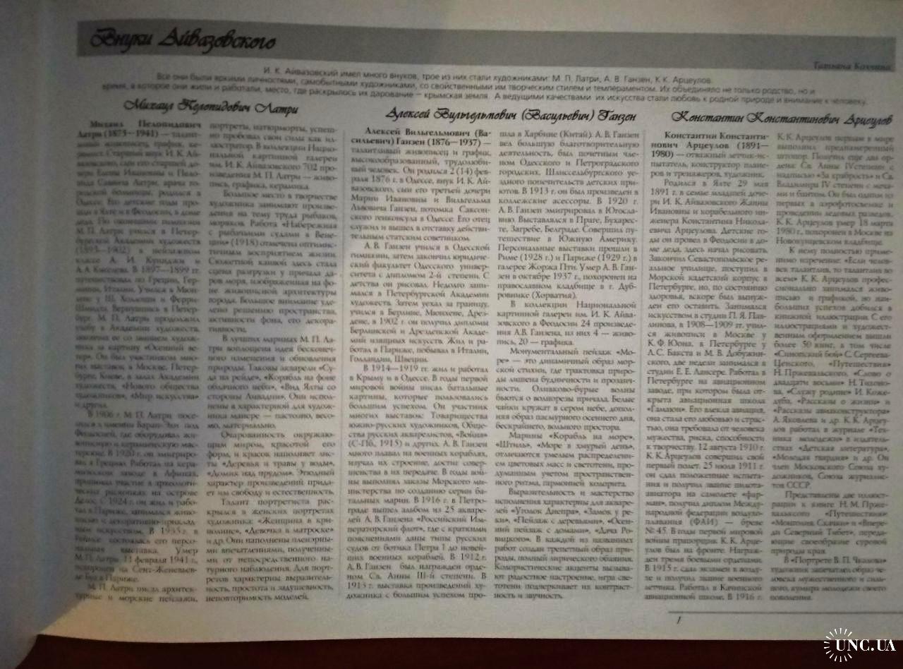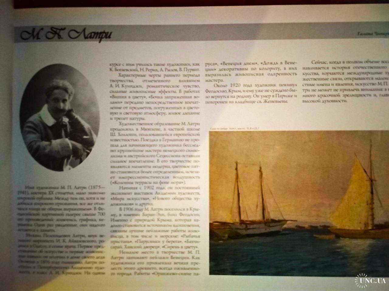 2 альбома "Внуки Айвазовского - Арцилов, Ганзен, Латри + Латри Михаил Пелопидович" - живопись, графика, издательство "Энергия плюс", Киев, Национальная картинная галерея им. И.К.Айвазовского, 16 + 16 = 32 страницы, маягкая обложка, альбомный формат, идеальное состояние. Альбомы куплены в галерее Айвазовского в Феодосии. В альбомах подробно рассказывается о творчестве внуков Айвазовского, их наследии, приведены репродукции наиболее знаковых произведений.
