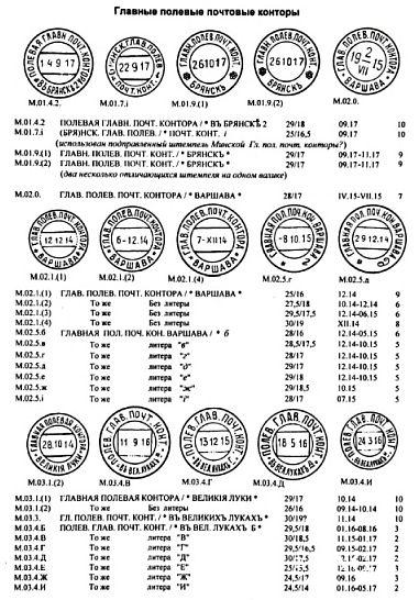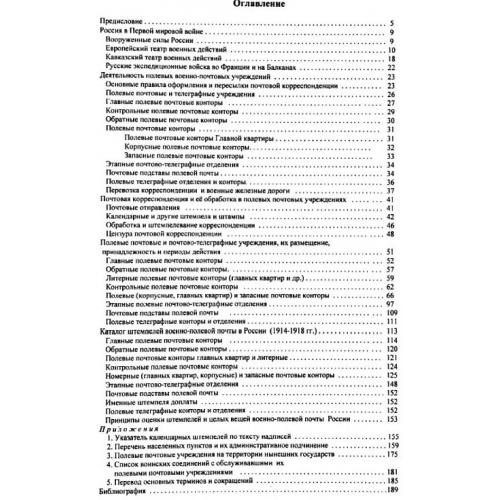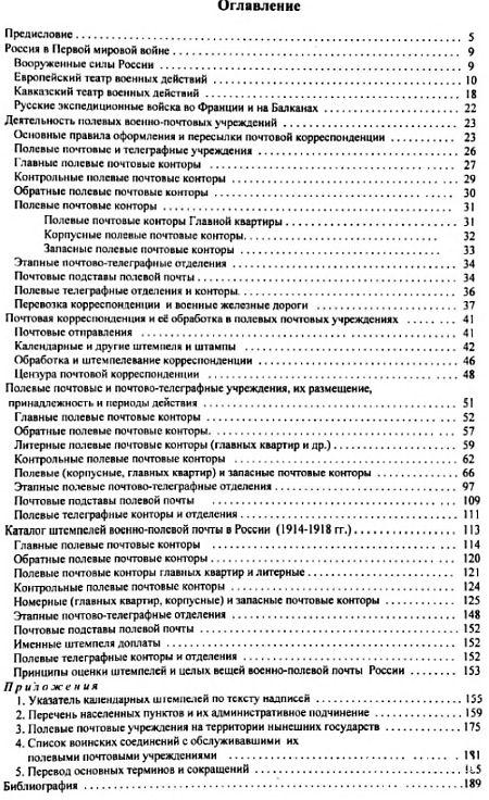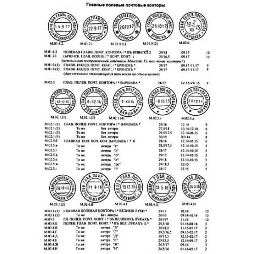 Основу справочника-каталога составляют полевые почтовые учреждения российской армии в период Первой мировой войны, их деятельность, места нахождения и используемые ими календарные штемпеля.