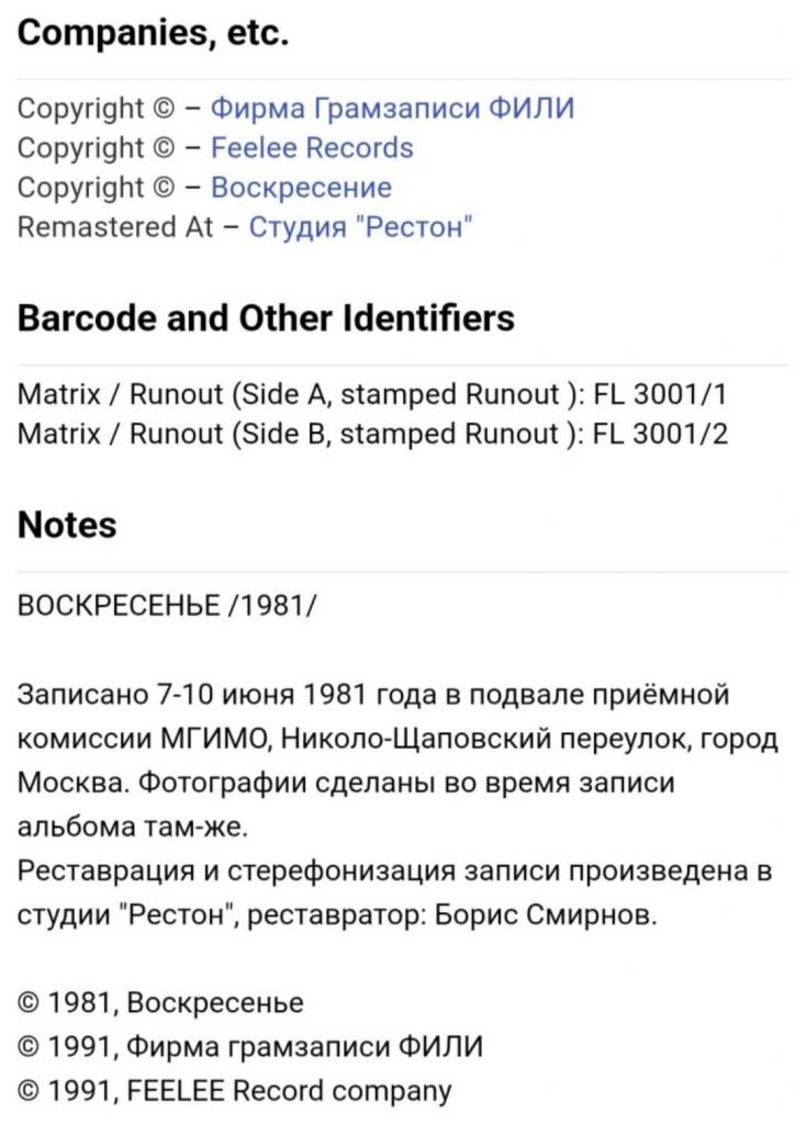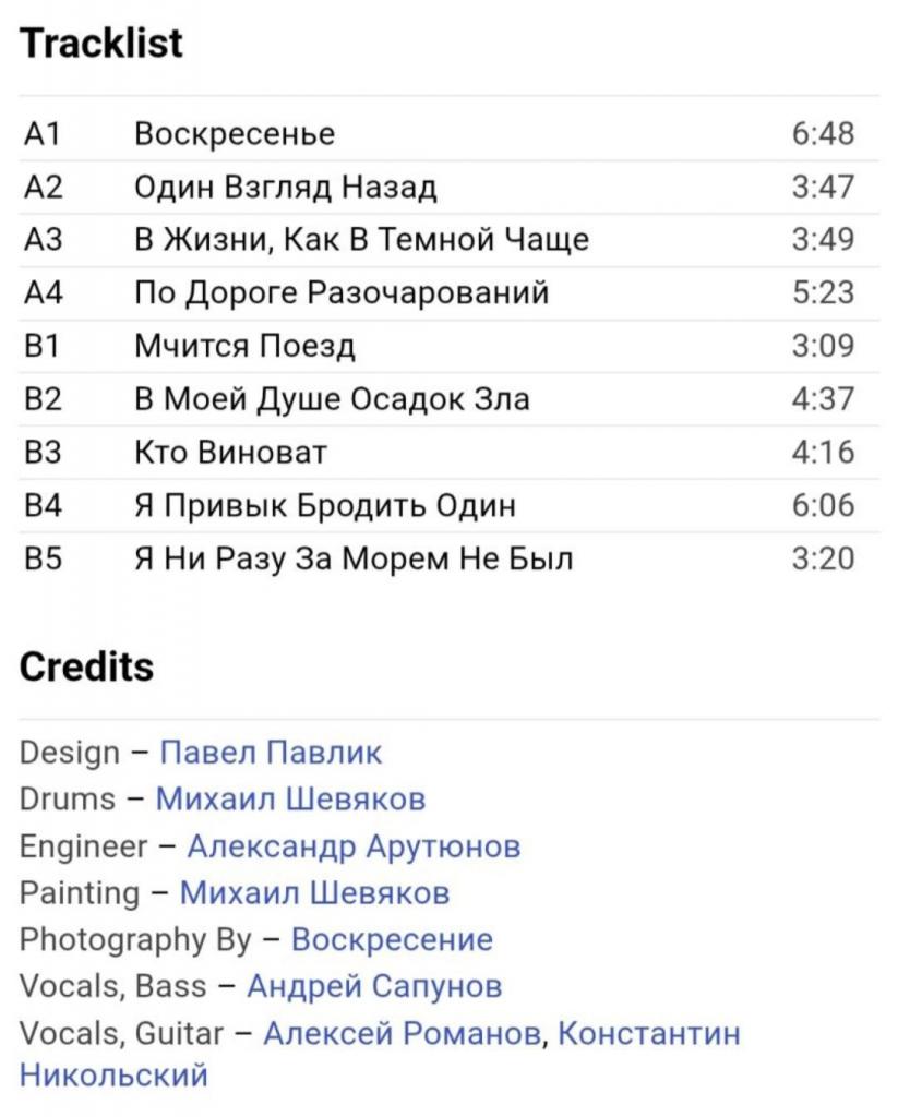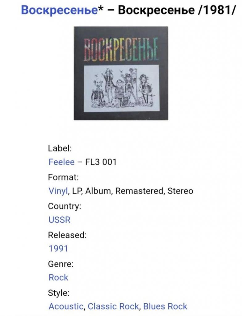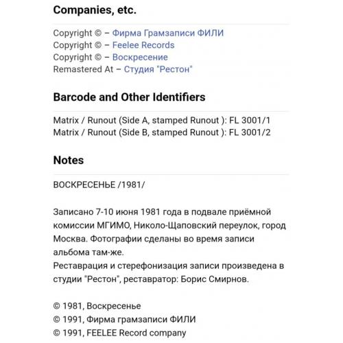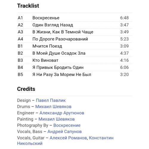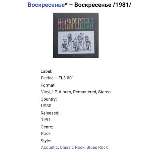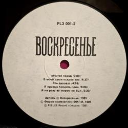 Вінілова платівка. Другий, в дискографії, студійний альбом, російської (радянської) арт-рок, прог-рок, блюз-рок групи Воскресенье, до складу якої, на той час, входили Константин Нікольський, Андрій Сапунов, Михайло Шевяков та Олексій Романов (Воскресенье) 1981. Випуск фірми (FeeLee) Russia, 1991-ий рік. Оригінальне, першопресове видання. Лімітований тираж (Limited Edition) Рідкісне (Rare). Стан платівки EX+. Стан конверту NM-. Відправка по Україні службами доставки: Нова Пошта, Укр Пошта, Делівері. Також відправляємо посилки за кордон по цілому світу.