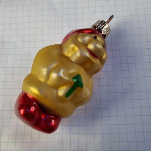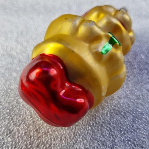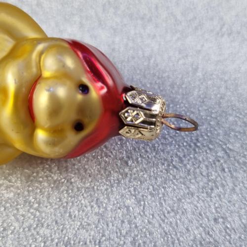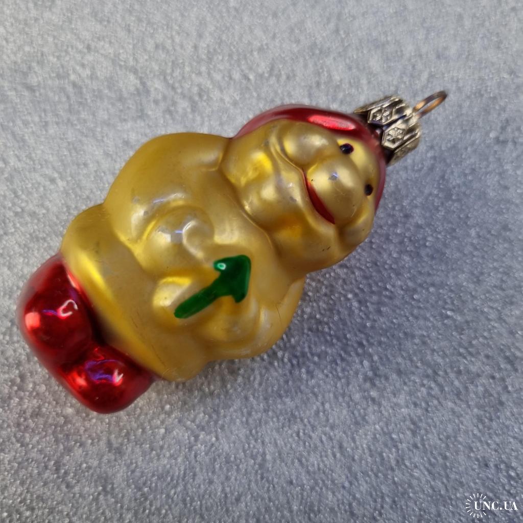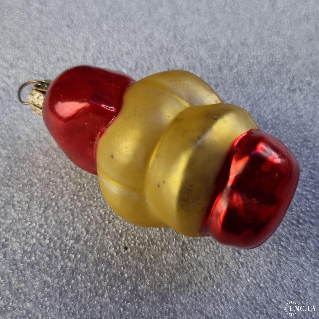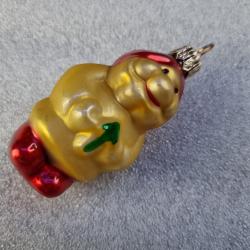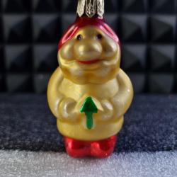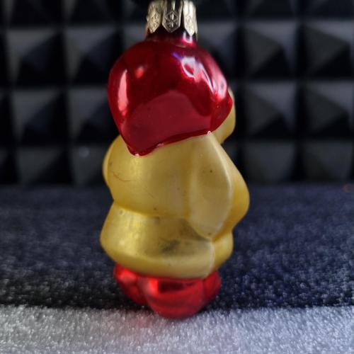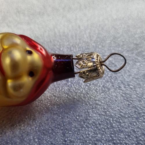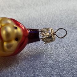 Вінтажна скляна ялинкова прикраса у формі гнома, з виразним усміхненим обличчям.