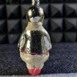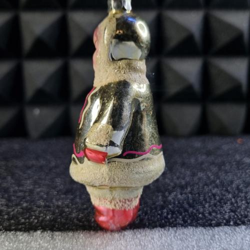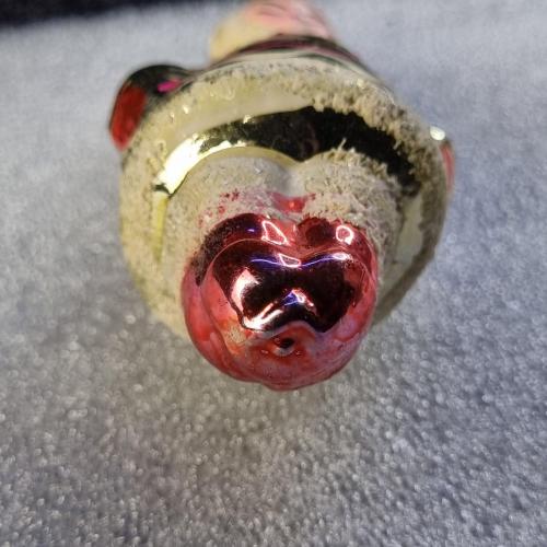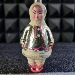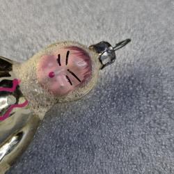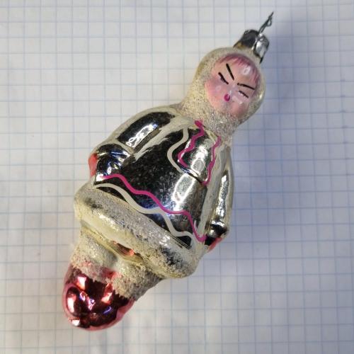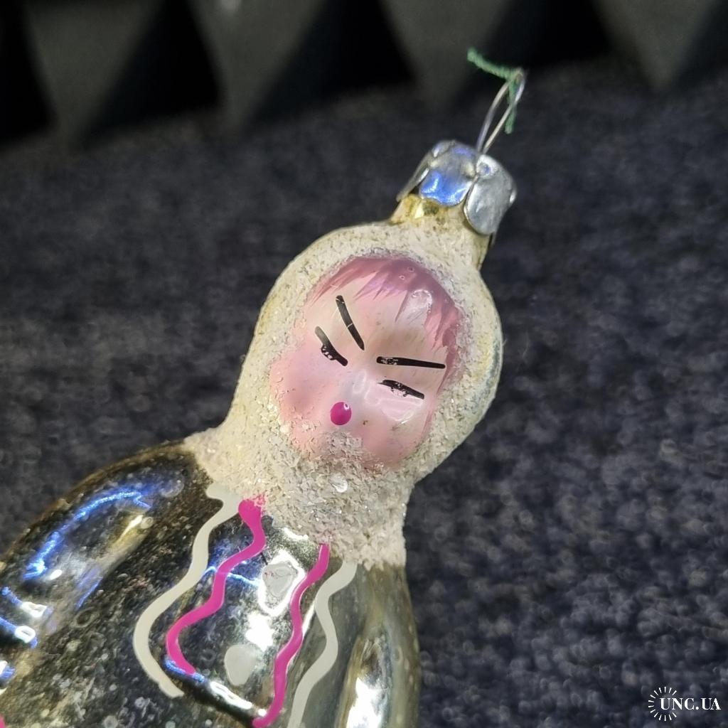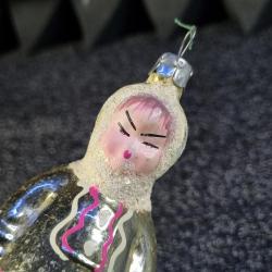 Вінтажна скляна ялинкова прикраса у формі дівчинки в зимовому вбранні. Ручний розпис: рожеві щічки, чорні брови, закриті очі.