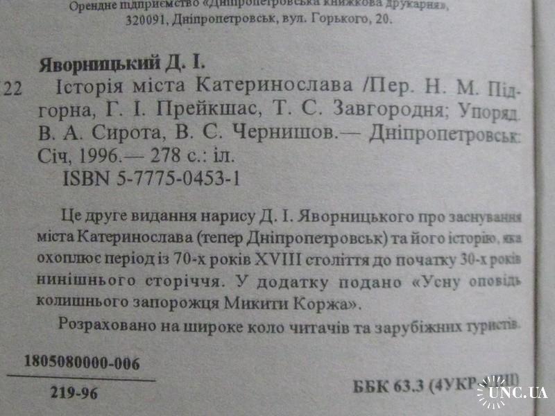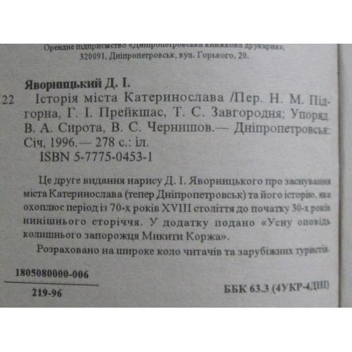 Це друге видання нарису Д.І. Яворницького про заснування міста Катеринослава (нині Дніпро) та його історію, що охоплює період із 70-х років ХVIII століття до початку 30-х років ХХ століття. У додатку вміщено "Усну розповідь колишнього запорожця Микити Коржа".