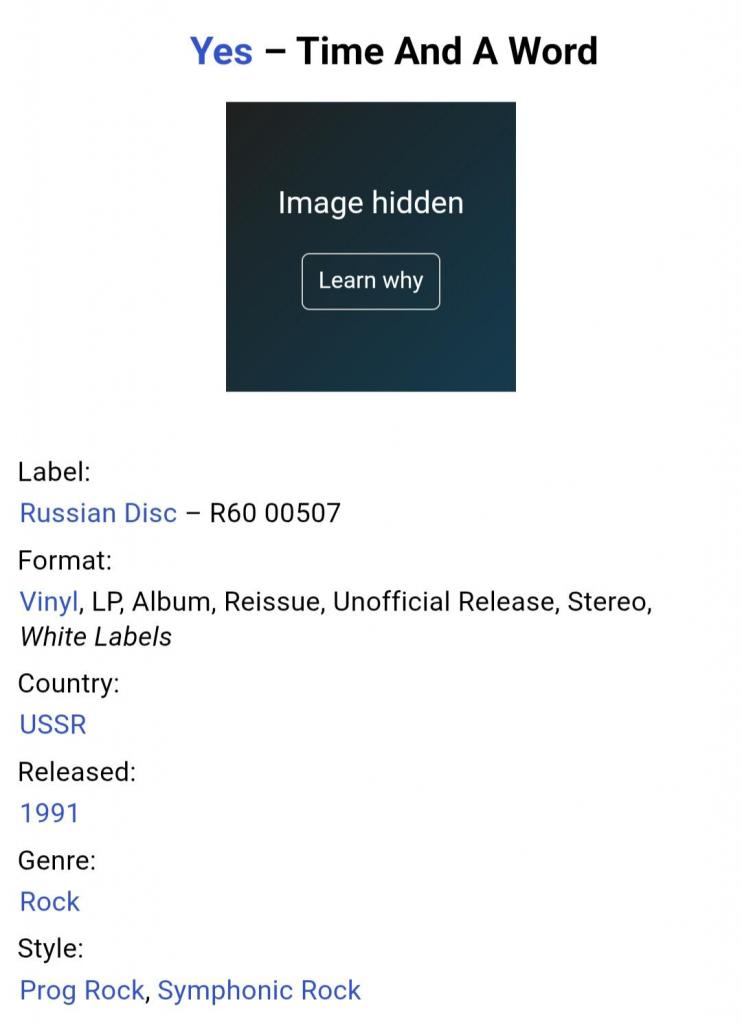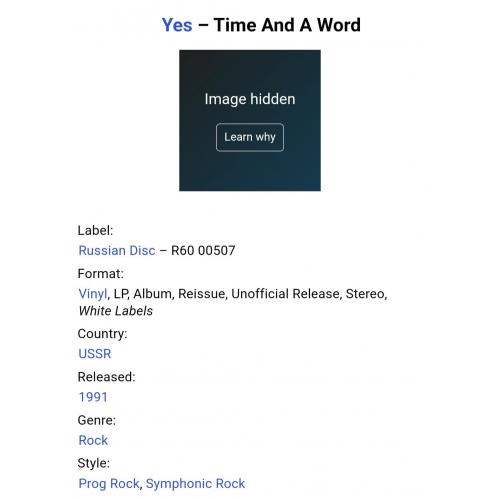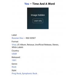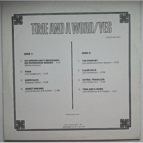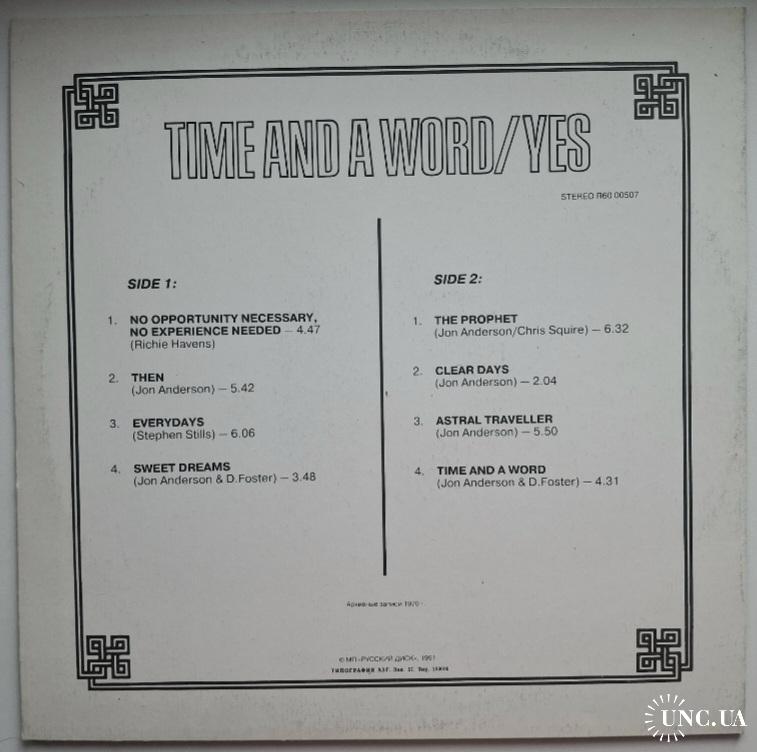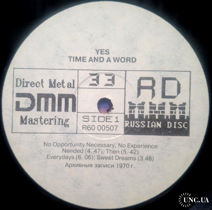 1961-1980Вінілова платівка. Другий, в дискографії, студійний альбом, Британської прог-рок групи Yes, учасниками якої були Кріс Сквайр, Стів Гау, Рік Вейкмен, Алан Вайт та Джон Андерсон (Time And Word) 1970. Неофіційне видання (Unofficial Release). Випуск фірми (Russian Disc) 1991-ий рік. Стан платівки NM-. Стан конверту NM-. Відправка по Україні службами доставки: Нова Пошта, Укр Пошта, Делівері. Також відправляємо посилки за кордон по цілому світу.