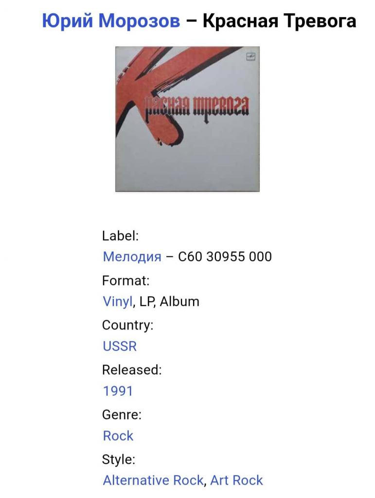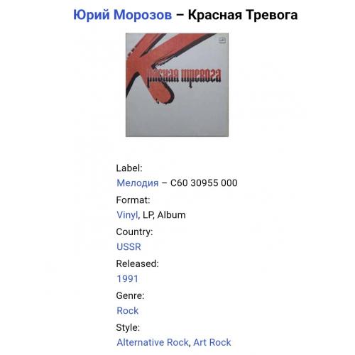 Вінілова платівка. Тридцять другий, в дискографії, студійний альбом, російського (радянського) мультиінструменталіста, арт-рок, блюз-рок виконавця, покійного вже, Юрія Морозова (Красная Тревога) 1989. Випуск фірми (Мелодія) СРСР, Ленінградський завод грамплатівок, 1991-ий рік. Оригінальне, першопресове видання. Лімітований тираж (Limited Edition). Рідкісне (Rare). Стан платівки NM-. Стан конверту NM-. Відправка по Україні службами доставки: Нова Пошта, Укр Пошта, Делівері. Також відправляємо посилки за кордон по цілому світу.