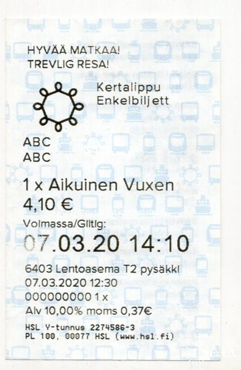 талон / билет на общественный транспорт в Хельсинки 07-03-2020