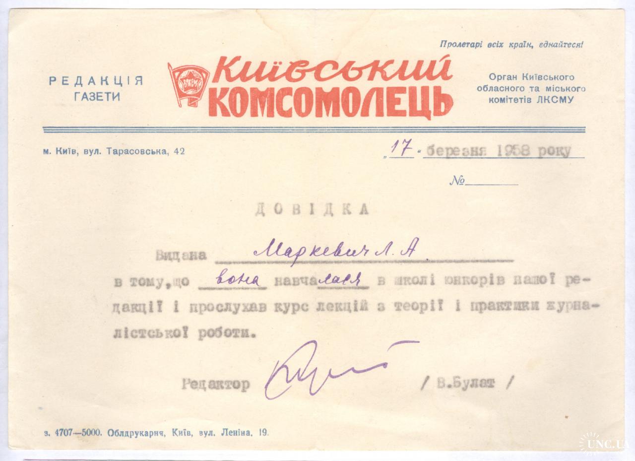 Киевский комсомолец Газета Київський комсомолець 1958 Довідка Л.А. Маркевич Школа юнкорів Пропаганда