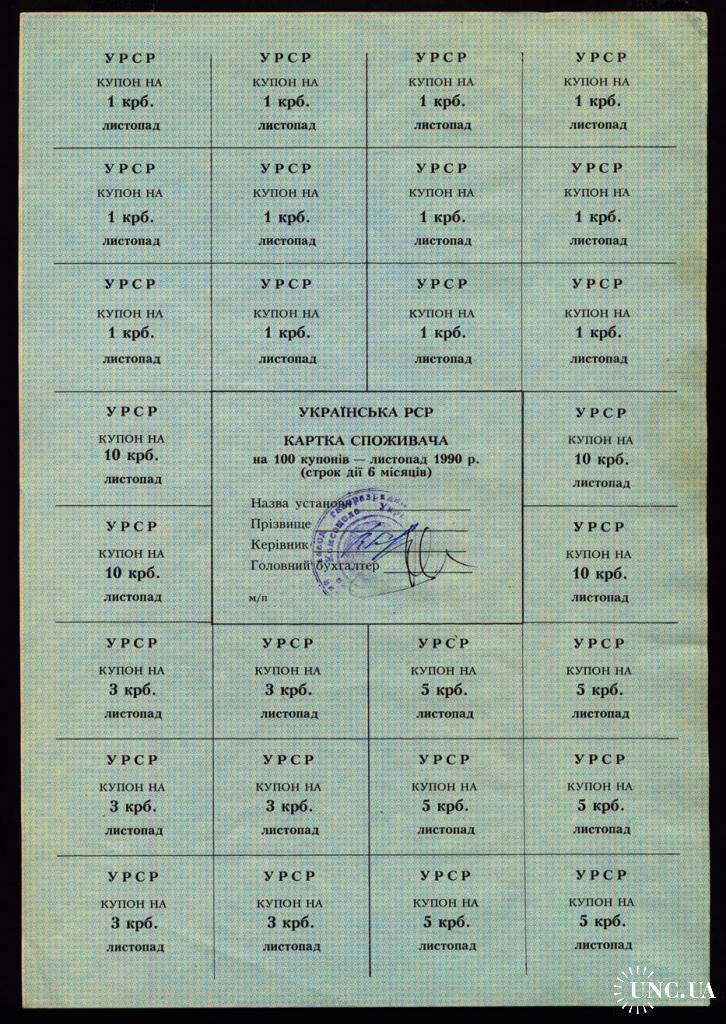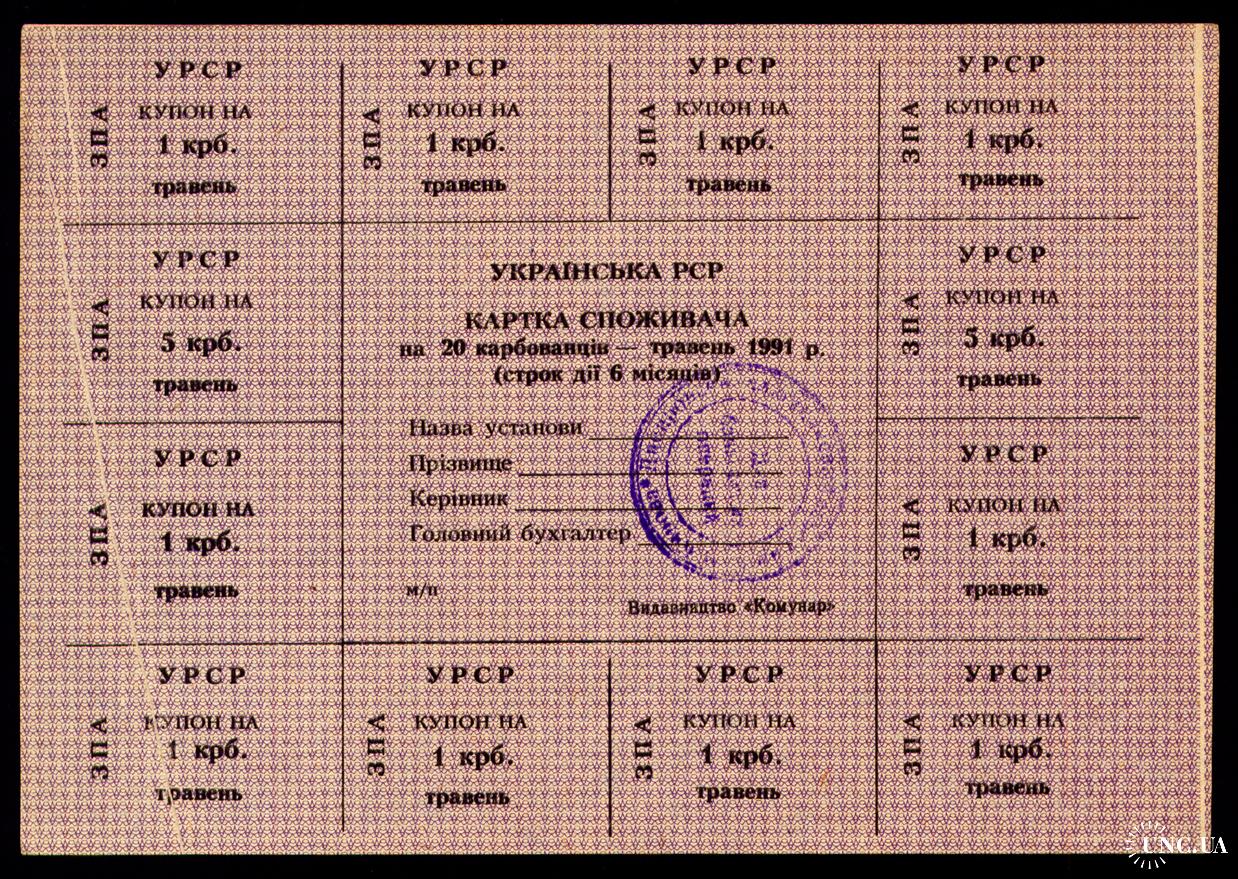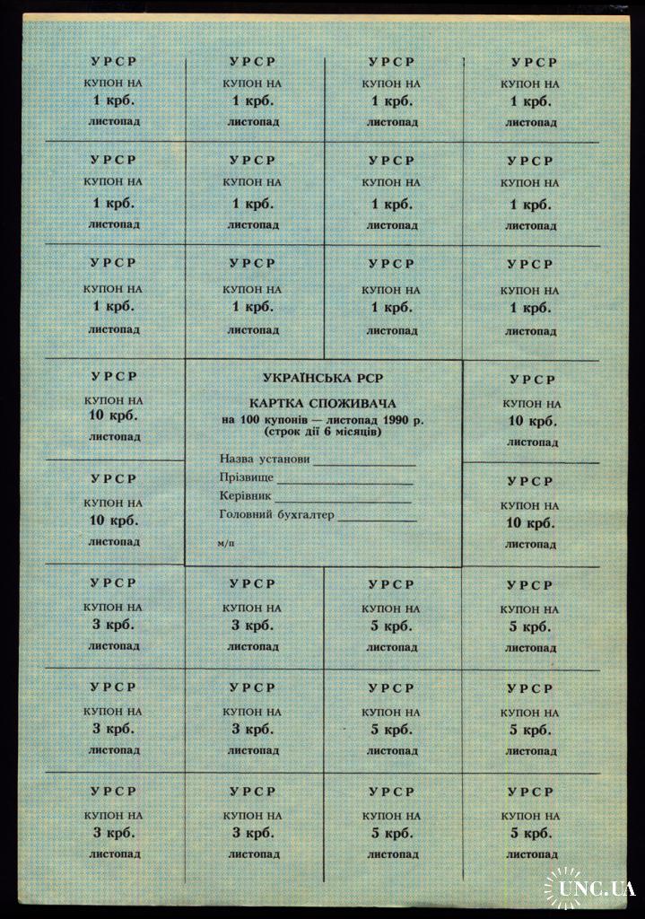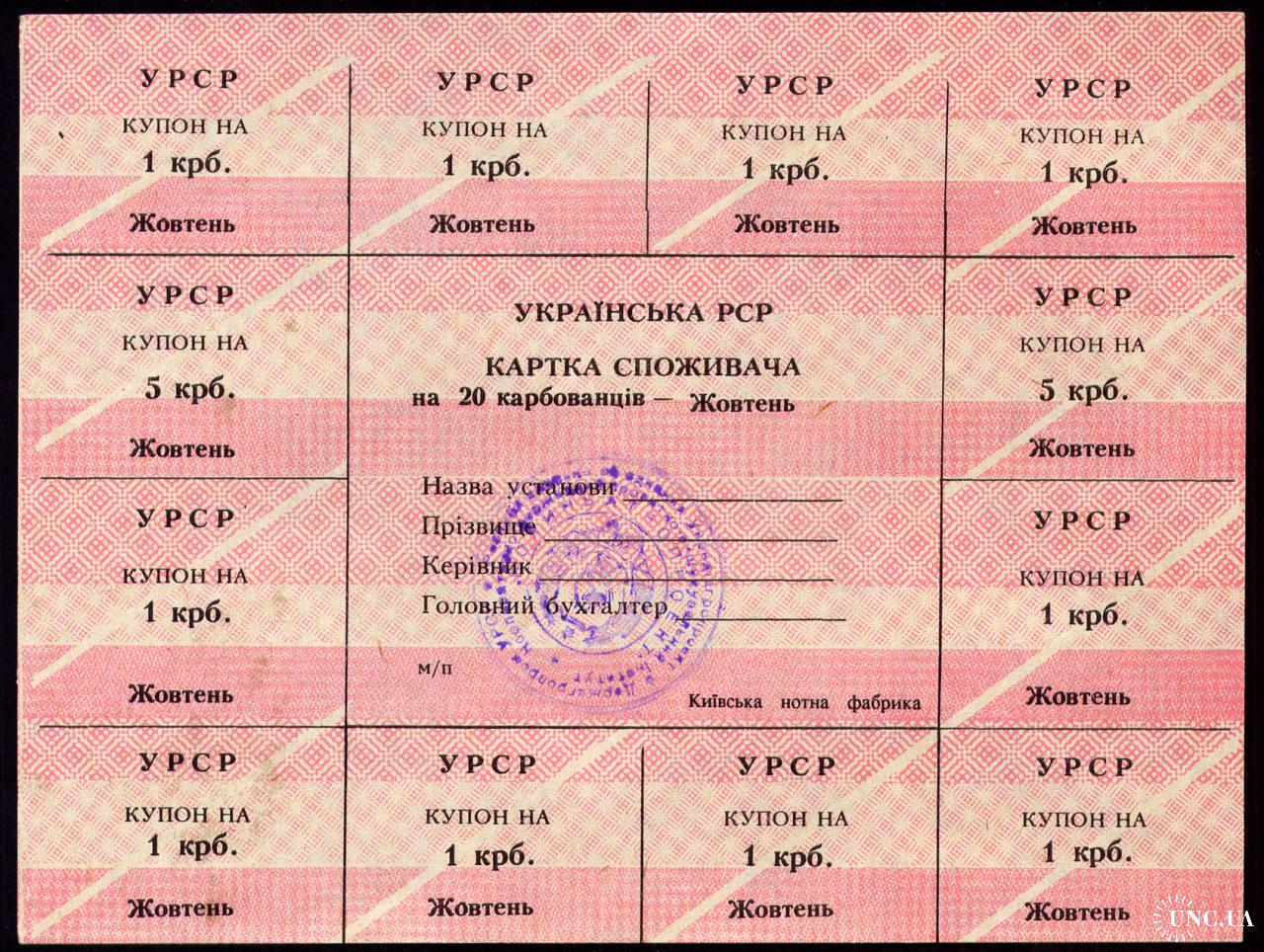 КАРТКА СПОЖИВАЧА R95.7 ВИДАВНИЦТВО "КОМУНАР" БРАК СКЛАДКА БУМАГИ ЗПА 20 КАРБОВАНЦІВ ТРАВЕНЬ 1991 Unc