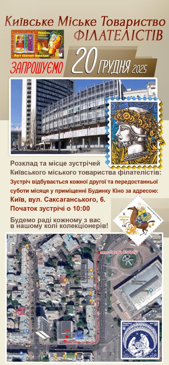 по адресу: Киев, ул. Саксаганского д. 6, Дом кино, конференц-зал, и каждую последнюю субботу месяца в Белом зале с 9:00 до 13:00 собираются филателисты Киева. Всем желающим предоставляются столы. Вход - 15 грн, персональный стол - 50 грн .