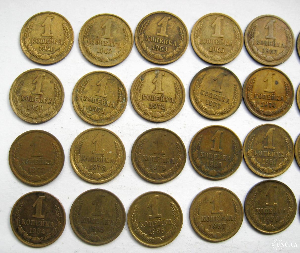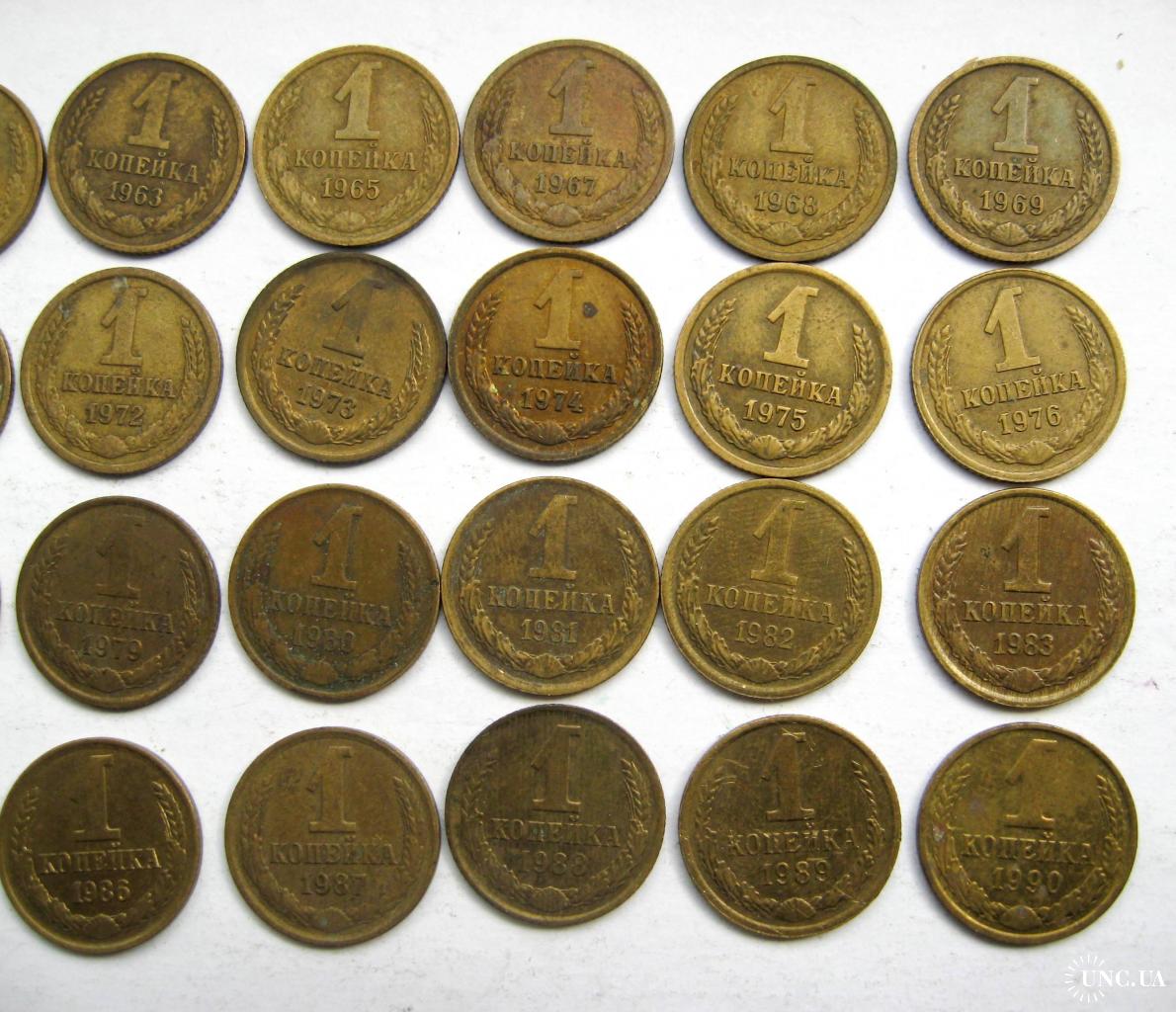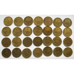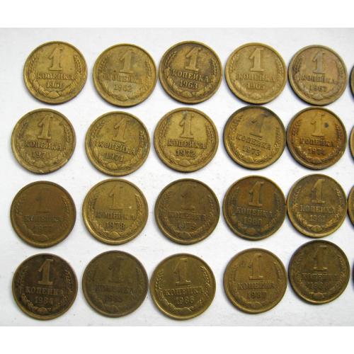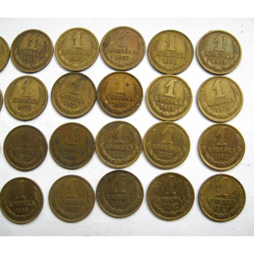 27 монет СРСР 1 коп.: 1961, 1962, 1963, 1965, 1967, 1968, 1969, 1970, 1971, 1972, 1973, 1974, 1975, 1976, 1977, 1978, 1979, 1980, 1981, 1982, 1983, 1984, 1985, 1986, 1987, 1988, 1989, 1990