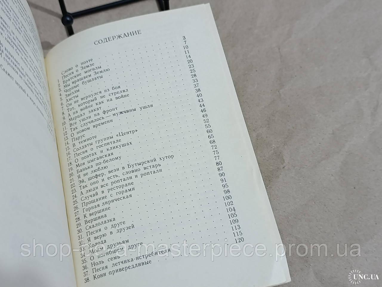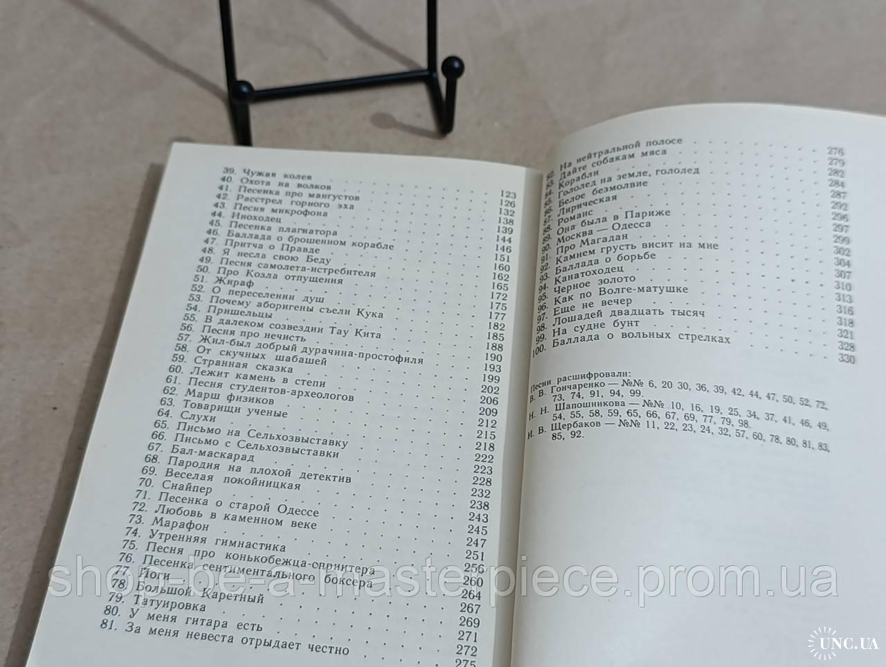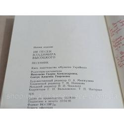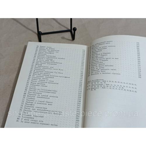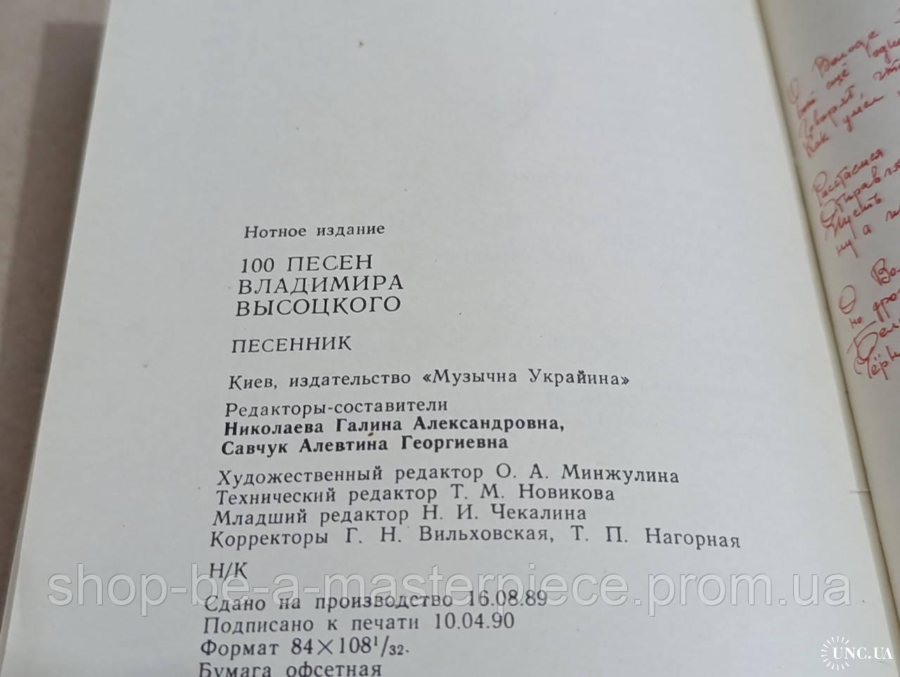 100 ПЕСЕН ВЛАДИМИРА ВЫСОЦКОГО. ПЕСЕННИК 1990 335 стр. мяка обкладинка. стан ідеал Киев, издательство «Музычна Украйина» Редакторы-составители Николаева Галина Александровна, Савчук Алевтина Георгиевна Технический редактор Т. М. Новикова Младший редактор Н. И. Чекалина Художественный редактор О. А. Минжулина Корректоры Г. Н. Вильховская, Т. П. Нагорная Формат 84×1081/32. Бумага офсетнаяВідповіді продавця на ваші питання