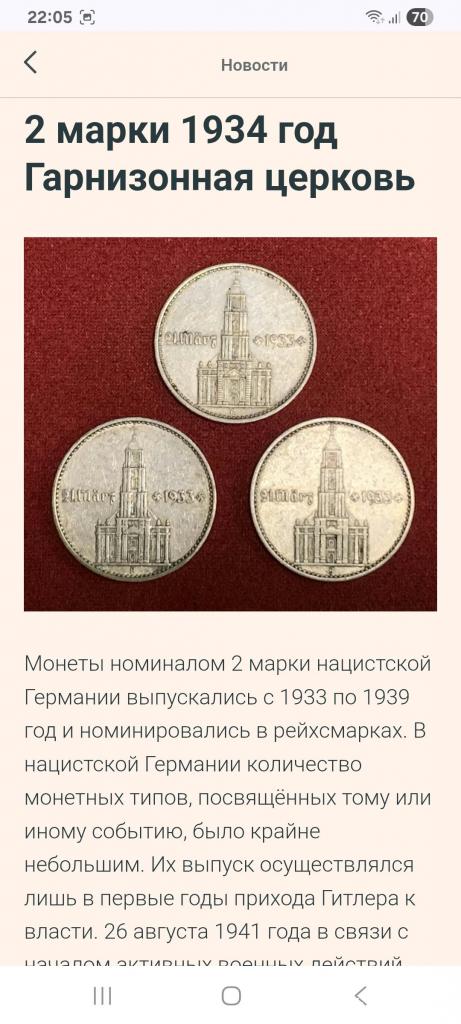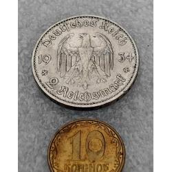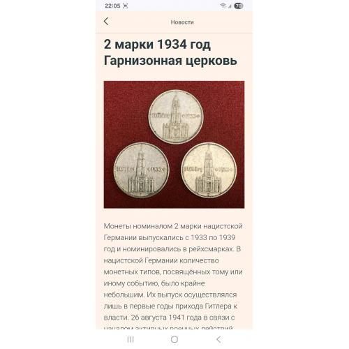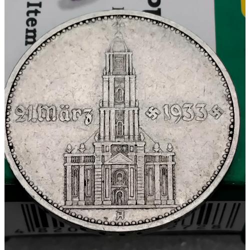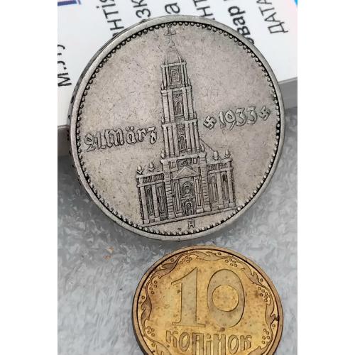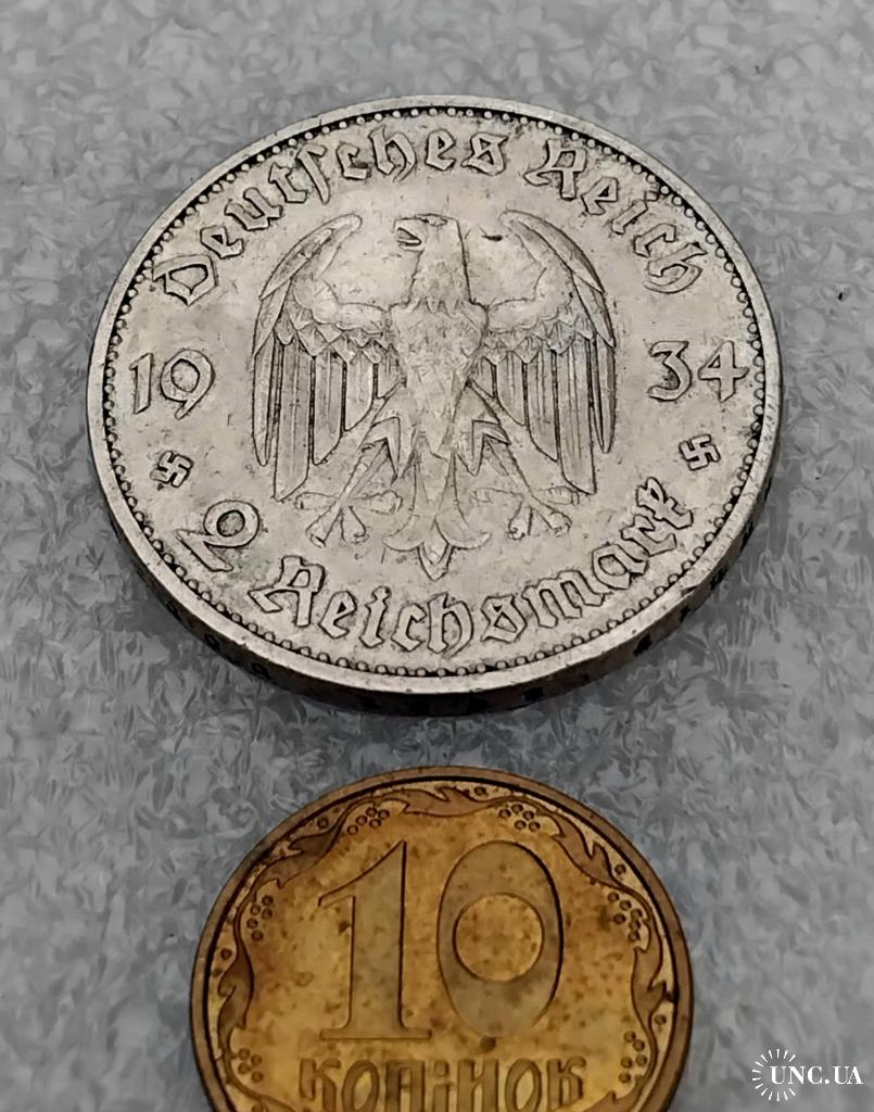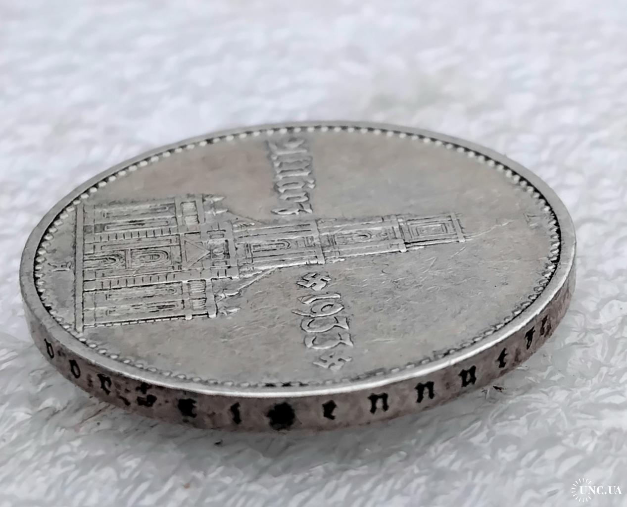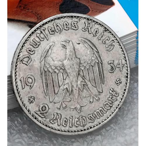 ОригіналН☝️2 рейхсмарки 1934г. (серебро)'Гарнизонная церковь'..выпуск посвящён к юбилею прихода Адольфа Гитлера к власти, тираж был ограничен.Состояние хорошее, монета не битая и не мятая,не шлифованая.Отправка наложным платежом при предоплате 100гр. (страховка доставки) остальная сумма оплачивается при получении.
