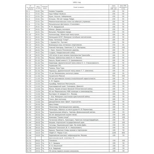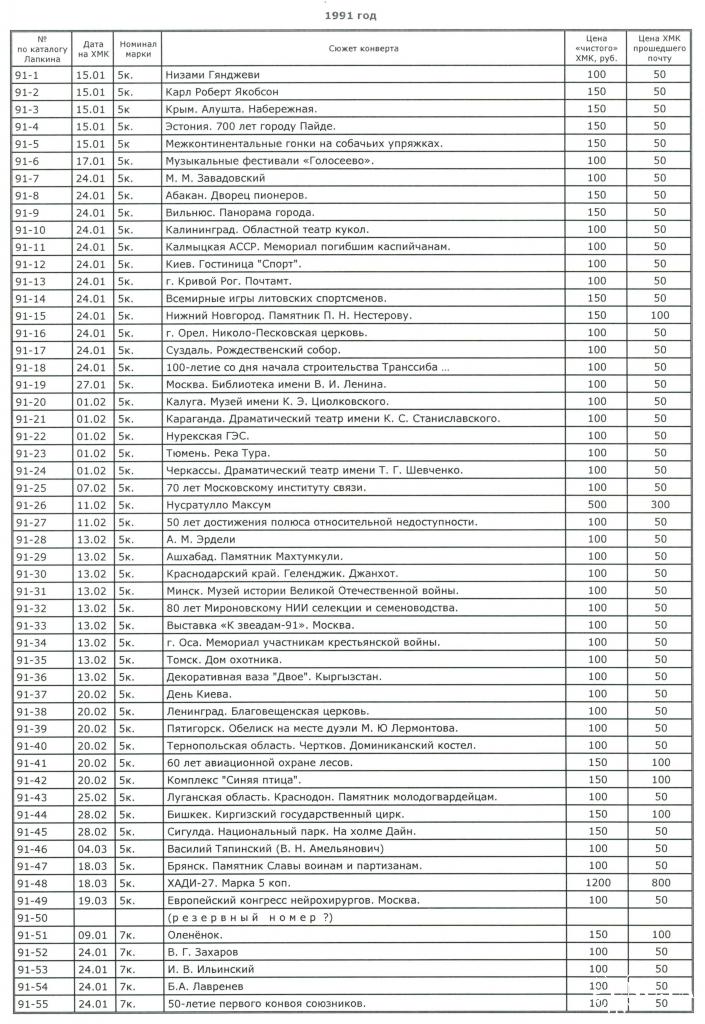 Конверты каждого года выпуска представлены отдельной таблицей. В таблице даны сокращённое или полное описание сюжета рисунка на ХМК, Цена «чистого» конверта и конверта, прошедшего почту, а также дата, указанная на лицевой или оборотной стороне (на клапане ХМК).