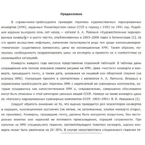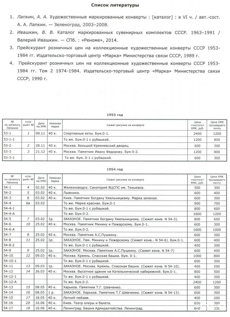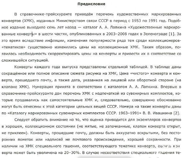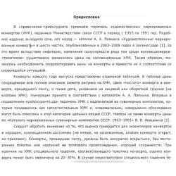 В справочнике-прейскуранте приведён перечень художественных маркированных конвертов (ХМК), изданных Министерством связи СССР в период с 1953 по 1991 год. Подобное издание выходило семь лет назад — каталог А.А. Лапкина «Художественные маркированные конверты» в шести частях, опубликованных в 2003-2008 годах в Зеленограде. За это время вследствие инфляции, изменения популярности ряда тем среди коллекционеров- «тематиков» существенно изменились цены на коллекционные ХМК. Таким образом, появилась необходимость скорректировать цены на конверты и привести их в соответствие со сложившейся ситуацией.
