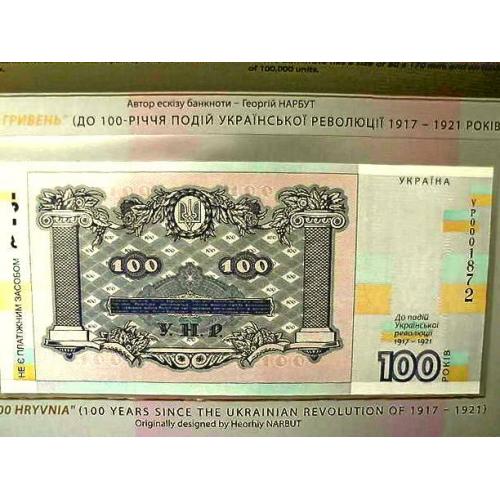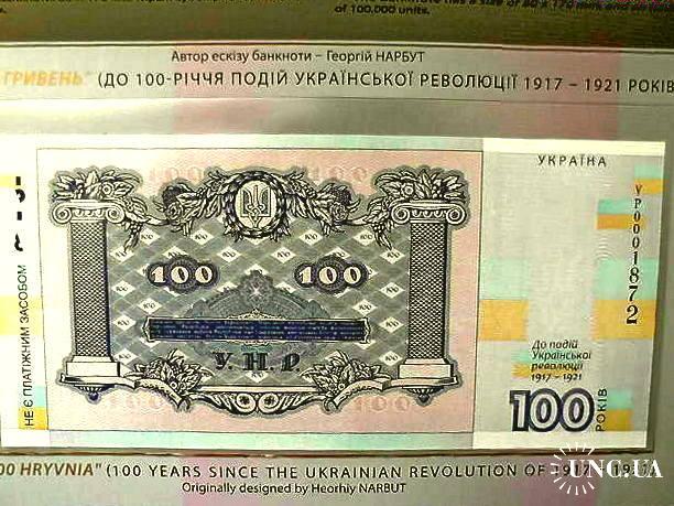 Сувенірна банкнота `Сто гривень` відтворює дизайн української банкноти номінальною вартістю 100 гривень, введеної в обіг 17 жовтня 1918 року. Навесні 1918 року український уряд ухвалив рішення змінити назву вітчизняних грошей із `карбованців` на `гривні`, бажаючи підкреслити спадковість традицій державотворення з часів Київської Русі. Найціннішою з мистецького погляду була купюра номіналом 100 гривень, розроблена і виконана Г. Нарбутом, на якій зображено пишний вінок із квітів, плодів, овочів, пшениці. Обабіч стоять жінка в національному вбранні зі снопом пшениці та серпом у руці і чоловік у фартуху, що спирається на молот, обвитий лавром. Написи зворотного боку включено у великий картуш із рослинно-плодового орнаменту, а по боках - декоративні колони. Увінчує всю композицію тризуб, обрамлений лавровим вінком. Банкнота виготовлена на папері з водяним знаком (зображення тризуба). Її розміри: 80 х 170 мм.